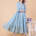 Cotton Calf Length Printed Flared 3/4 Sleeves Round Neck Kurta