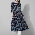 Rayon Calf Length Printed Semi-Flared 3/4 Sleeves Round Neck Kurta