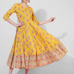 Cotton Calf Length Printed Flared 3/4 Sleeves Round Neck Kurta