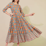 Cotton Calf Printed Flared 3/4 sleeves Round Neck Kurta
