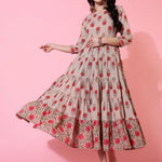Cotton Calf Length Flared 3/4 Sleeve Printed Round Neck Kurta