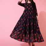 Cotton Calf Length Flared 3/4 Sleeve Printed Round Neck Kurta