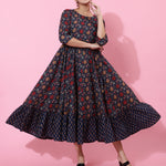 Cotton Calf Printed Flared 3/4 Sleeve Round Kurta
