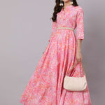 Cotton Full Length Printed Flared 3/4 Sleeve Collar Neck Kurta
