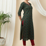 Cotton Calf Length Printed Straight 3/4 Sleeves Round Kurta