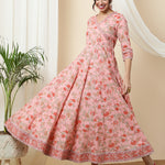 Cotton Ankle Length Printed Flared 3/4 Sleeves V-Neck Kurta