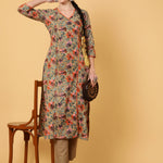 Cotton Calf Length Printed Straight 3/4 Sleeves V-Neck Kurta