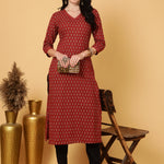 Cotton Calf Length Printed Straight 3/4 Sleeves V-Neck Kurta