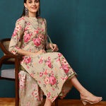 Cotton Flex Calf Length Length Floral Straight 3/4 Sleeves V Kurta