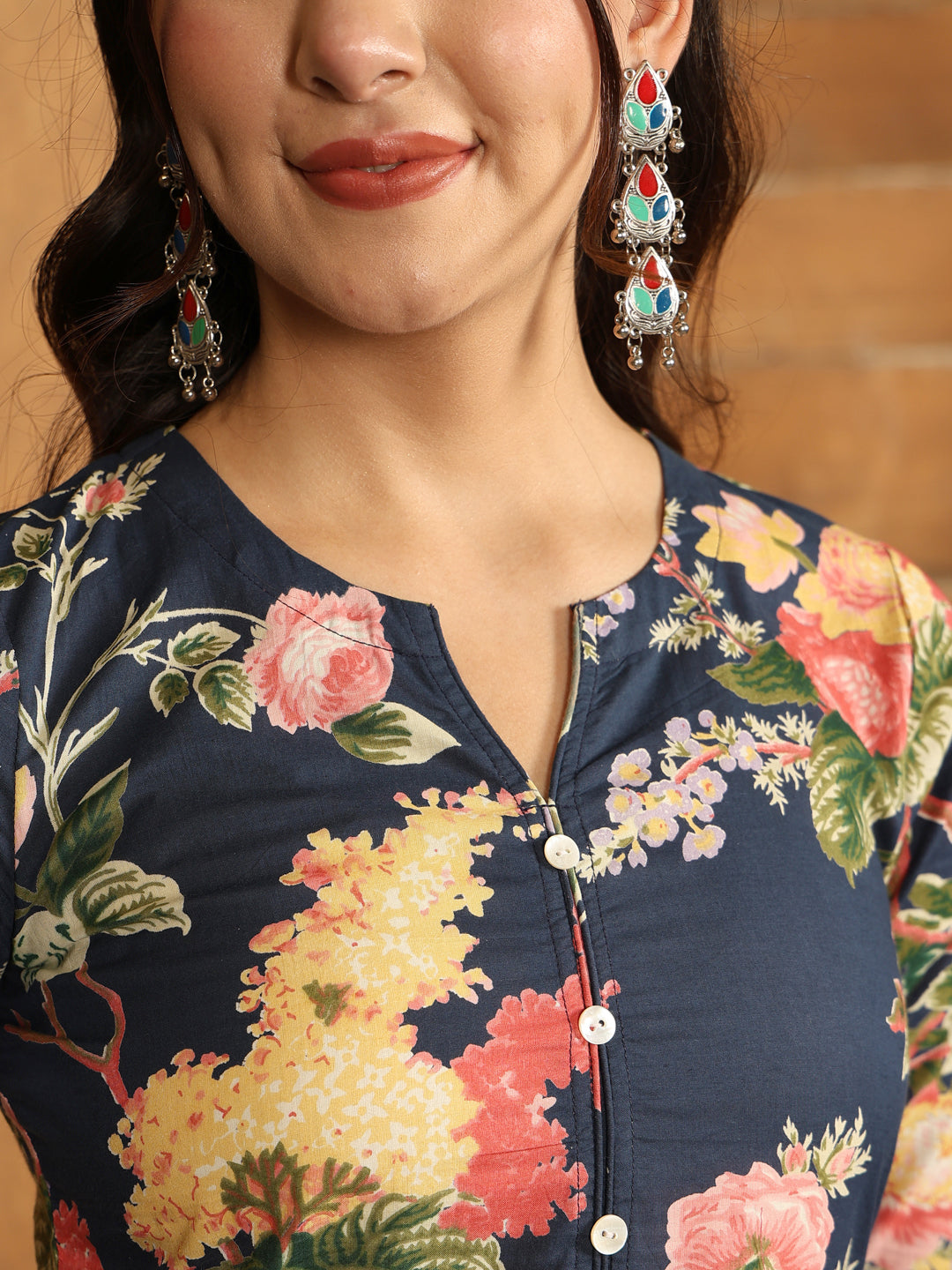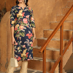 Cotton Calf Length Printed Straight 3/4 Sleeves Round Neck Kurta
