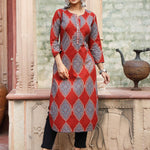 Cotton Calf Length Printed Straight 3/4 Sleeves Round Neck Kurta