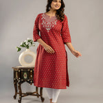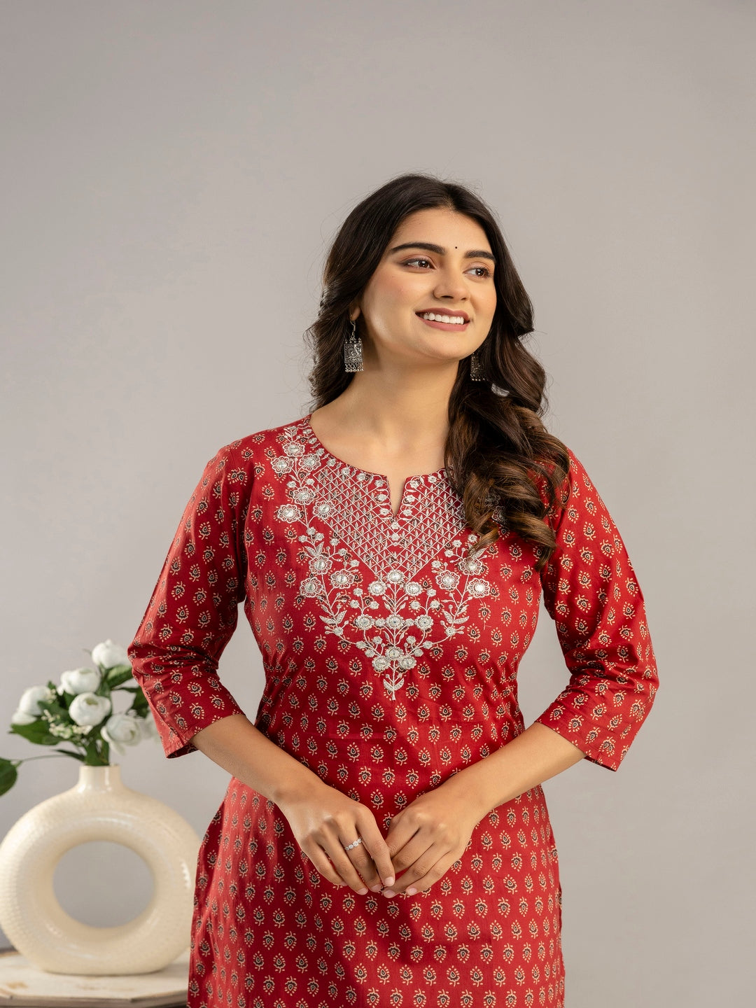 Cotton Calf Length Printed Straight 3/4 Sleeves Round Neck Kurta
