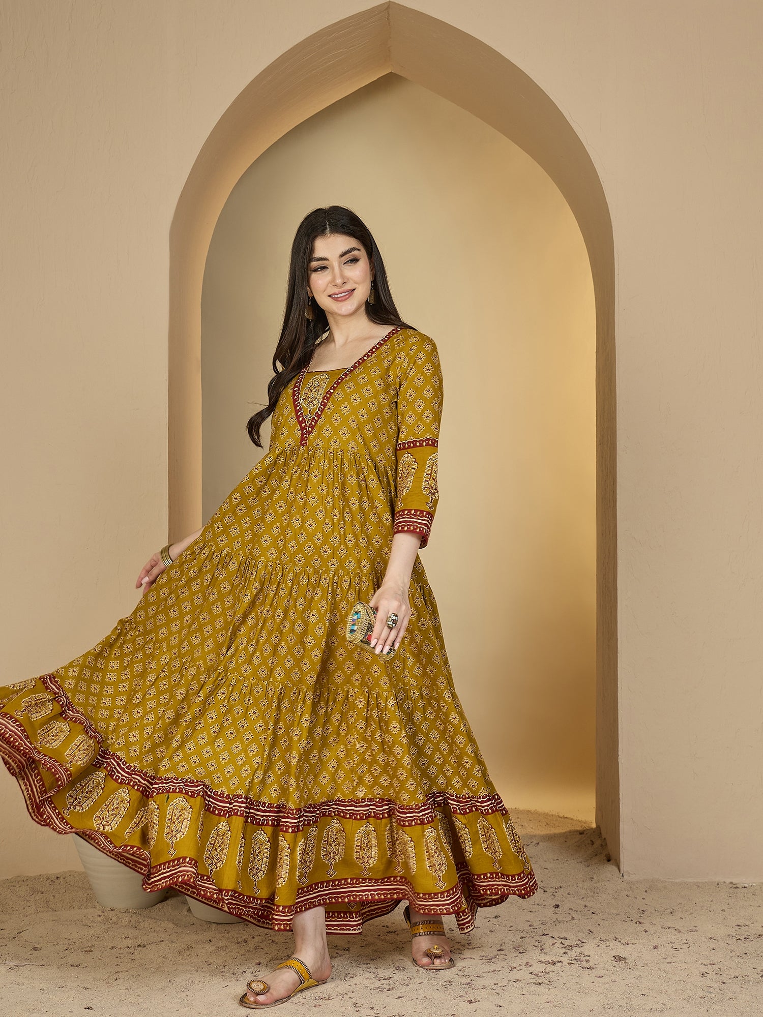 Cotton Ankle Length Printed 3/4 Sleeves V-Neck Anarkali Kurta