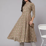 Cotton Calf Length Flared 3/4 Sleeve Mandarin Neck Printed Kurta