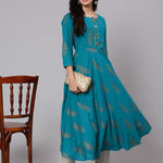 Cotton Calf Length Flared 3/4 Sleeve Round Neck Printed Kurta