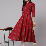 Cotton Calf Length Flared 3/4 Sleeve Mandarin Neck Printed Kurta