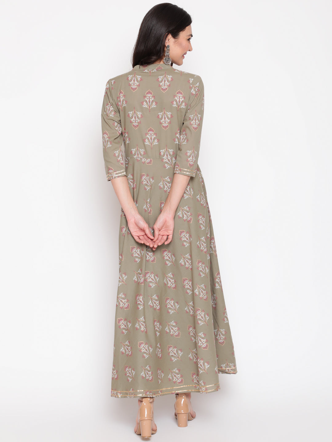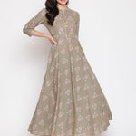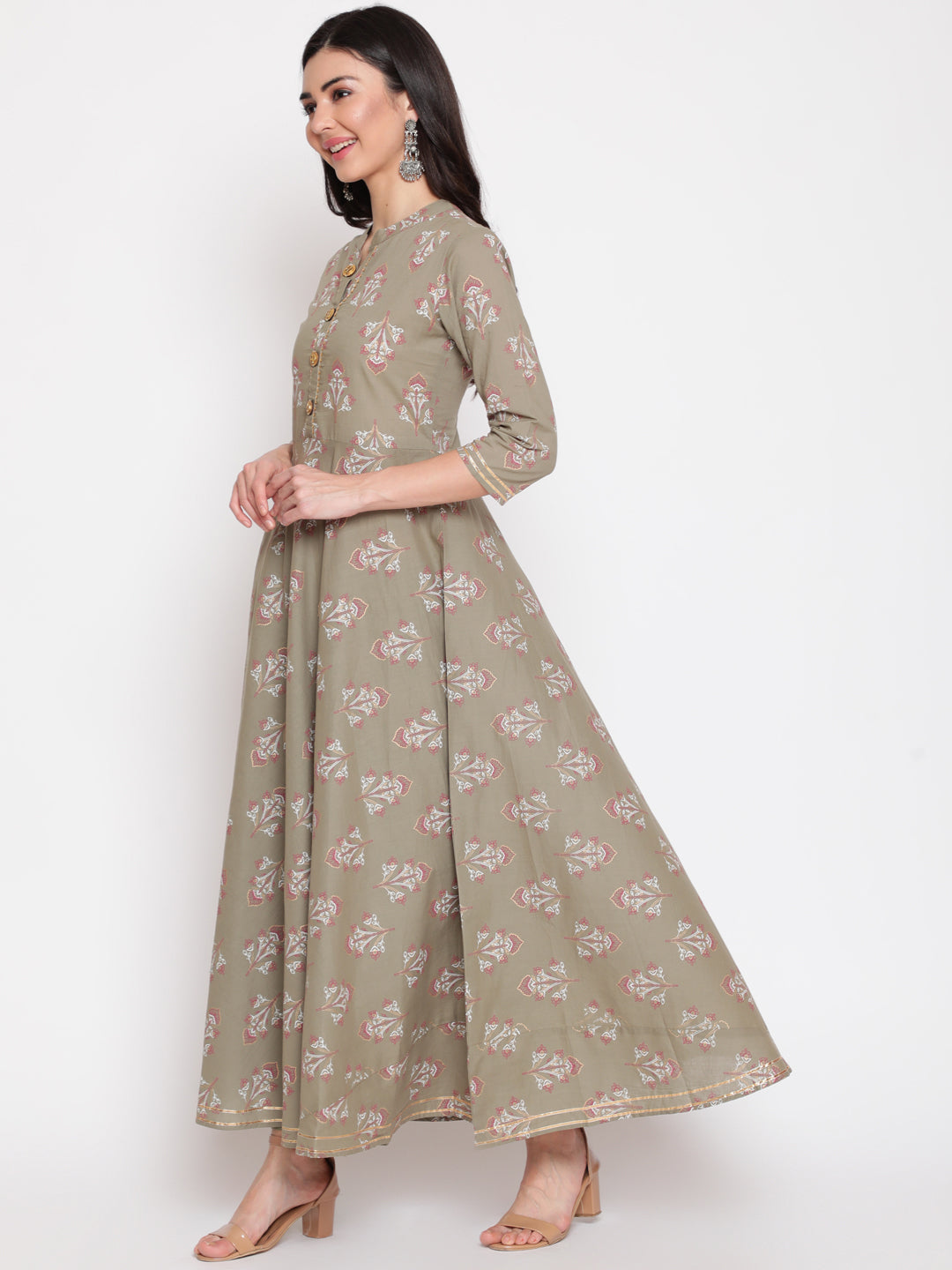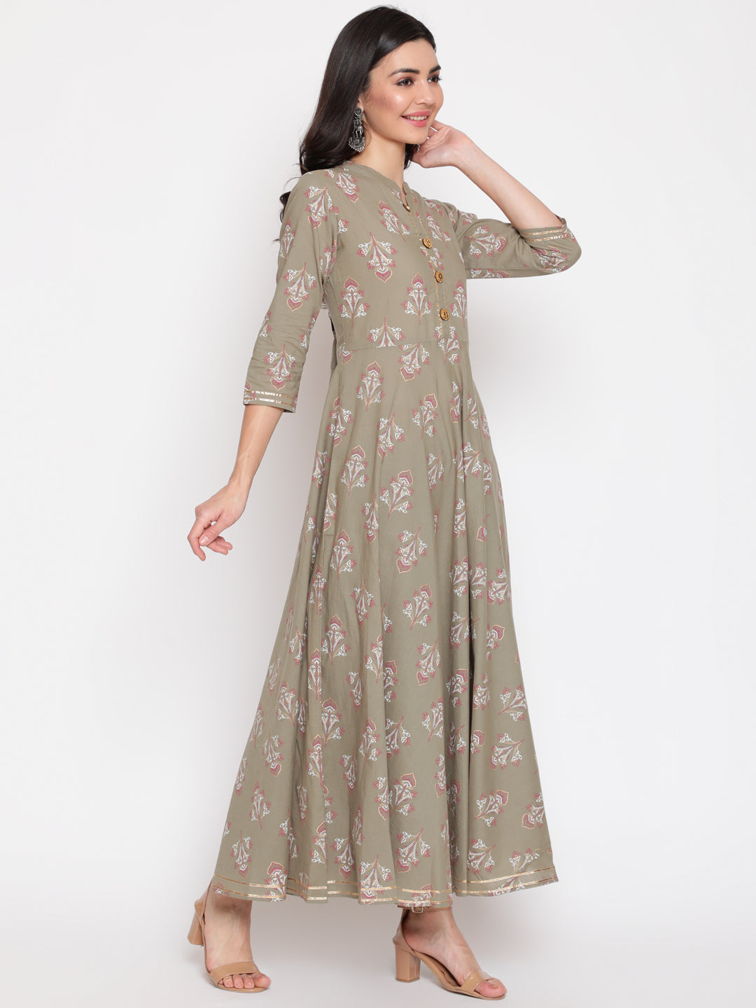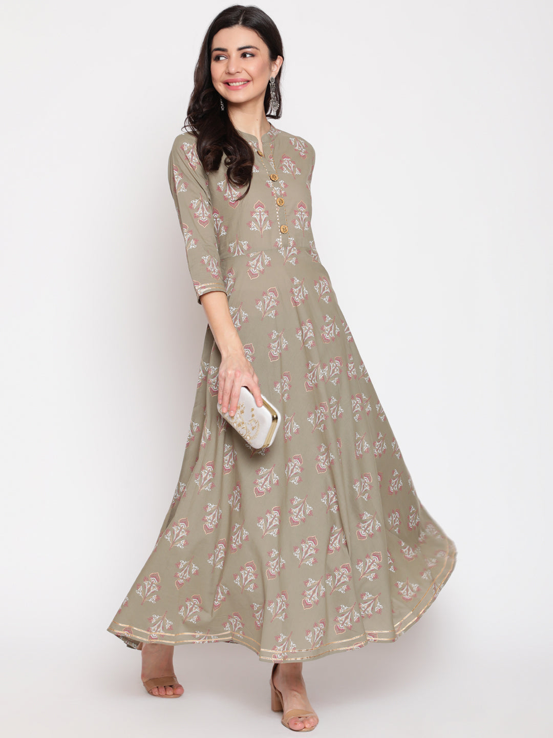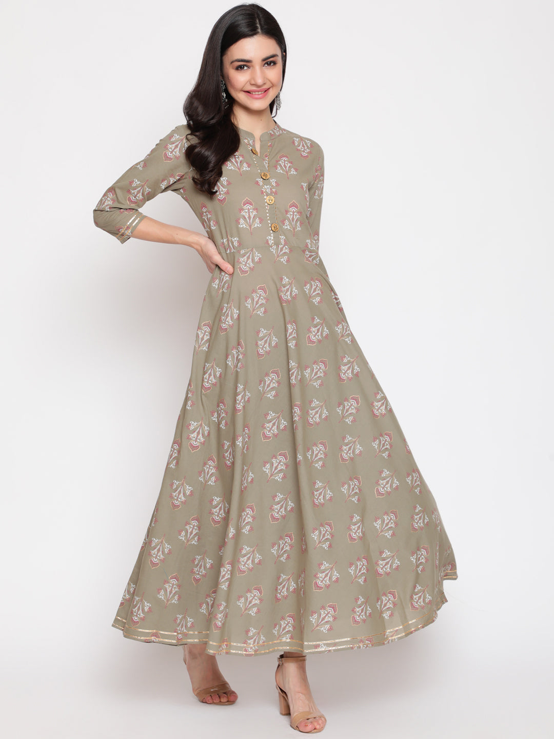Cotton Printed Mandarin Neck 3/4 Sleeve Flared Ankle Length Ethnic Kurta