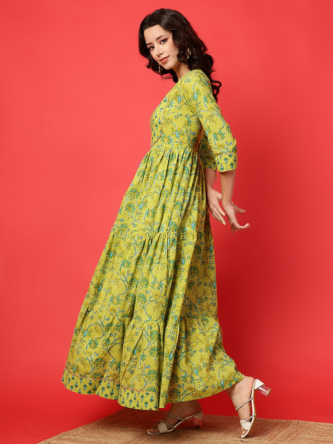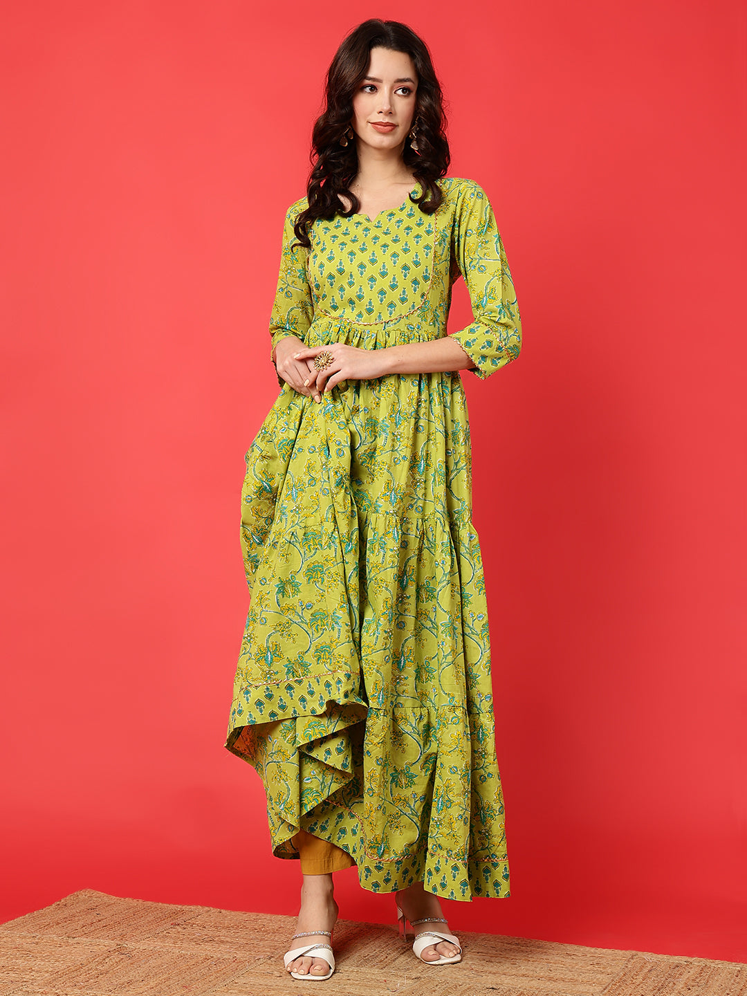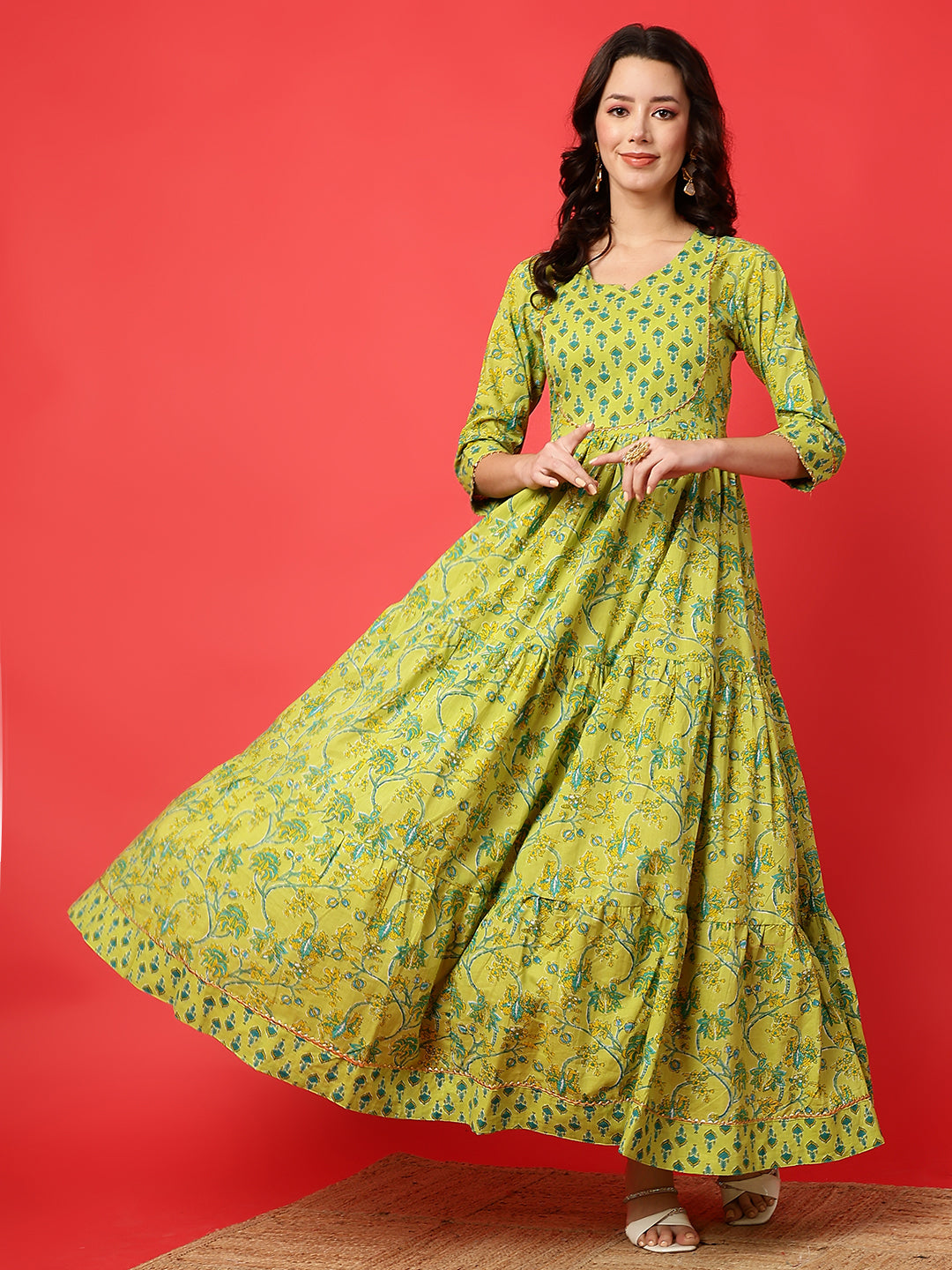 Rayon Printed Ankle Length 3/4 Sleeve Round Neck Tiered Kurta