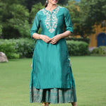 Bottle Green Chanderi Festive Embroidered + Printed Straight/Flared Kurta