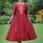 Maroon Chanderi Festive Embroidered + Polka Dot Printed Flared Kurta
