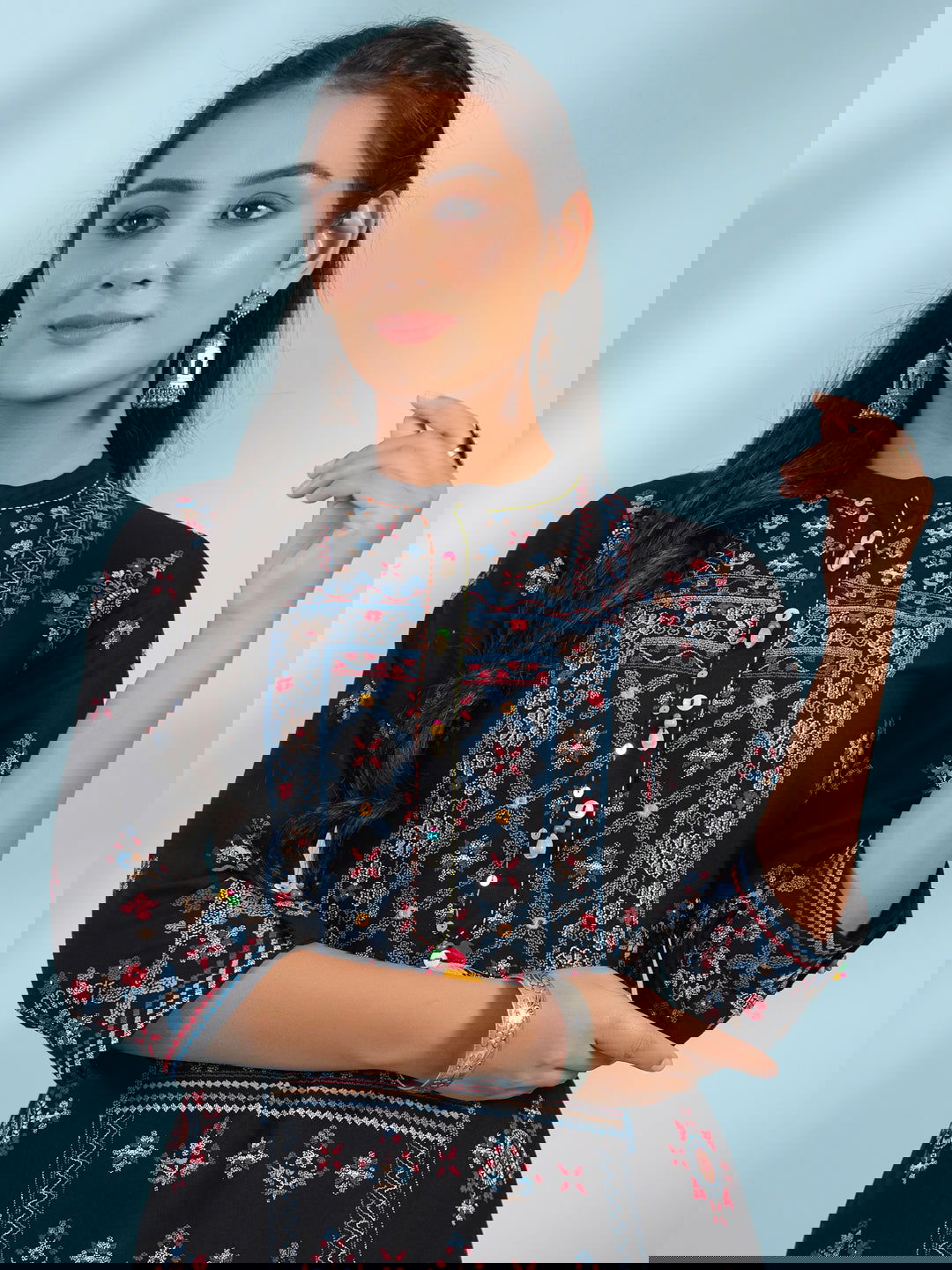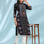 Black Ethnic Motif Printed Rayon Calf Length Straight Kurta With Kaudis Kantha Work & Sequins