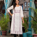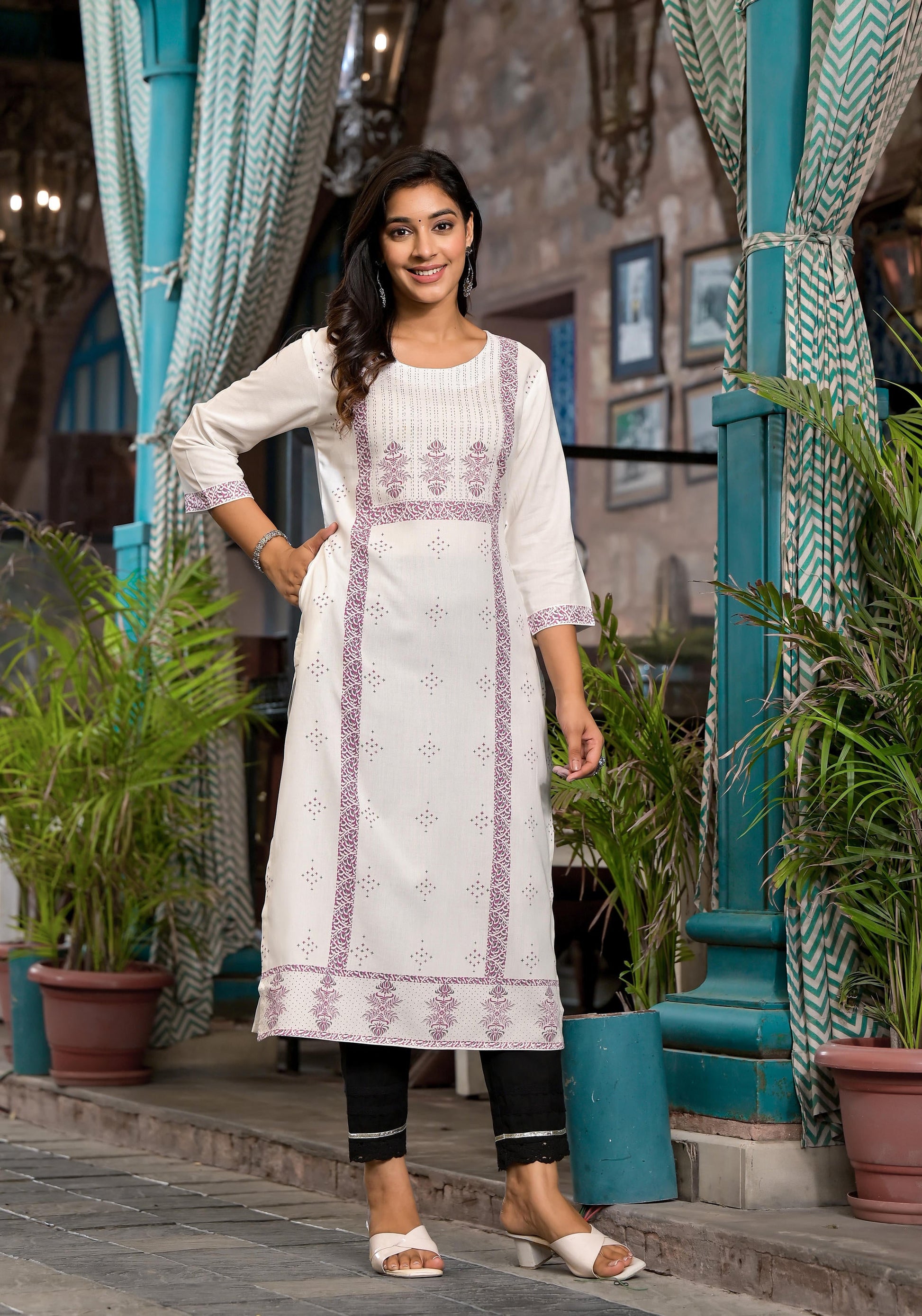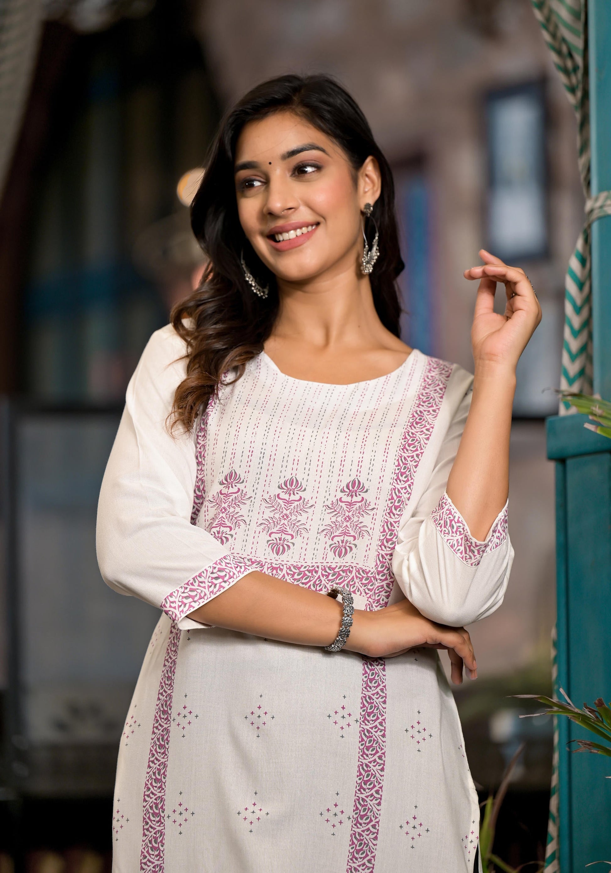 White Ethnic Motif Printed Rayon Round Neck Kurta With Straight Hemline For Women