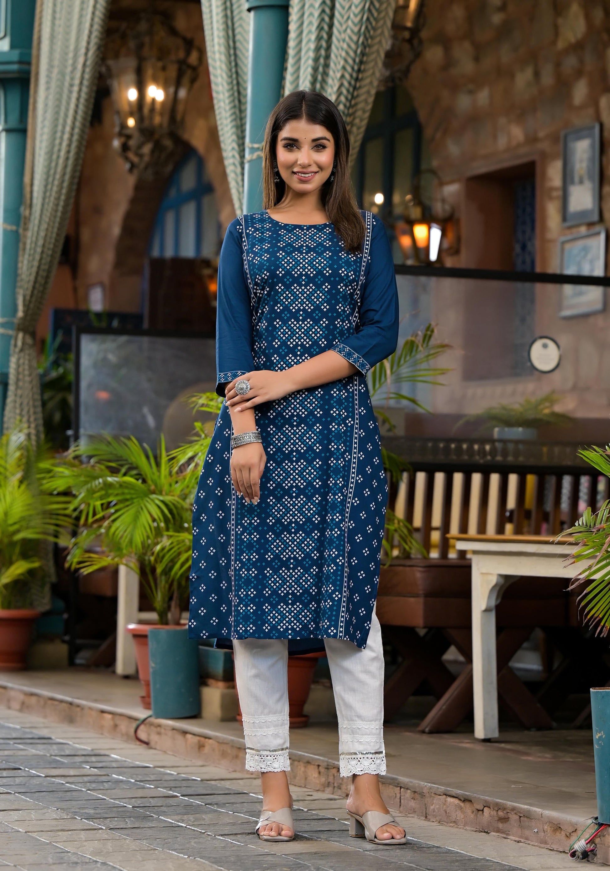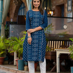 Teal Ethnic Motif Printed Round Neck Rayon Kurta With Straight Hemline