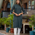 Bottle Green Striped Printed Cotton Kurta With Button Detail