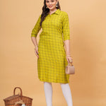 Checks Print Shirt Collar 3/4 Sleeves Calf Length Rayon Straight Kurta