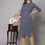 Blue Self-Design Straight Kurta - Rayon Fabric, 3/4 Sleeves, Mandarin Collar And Calf Length