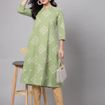 Green Floral Printed Kurta - Rayon Fabric, 3/4 Sleeves, Mandarin Collar And Calf Length