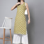 Green Leaf Print Kurta - Rayon Fabric, Sleeveless, Round Neck And Calf Length