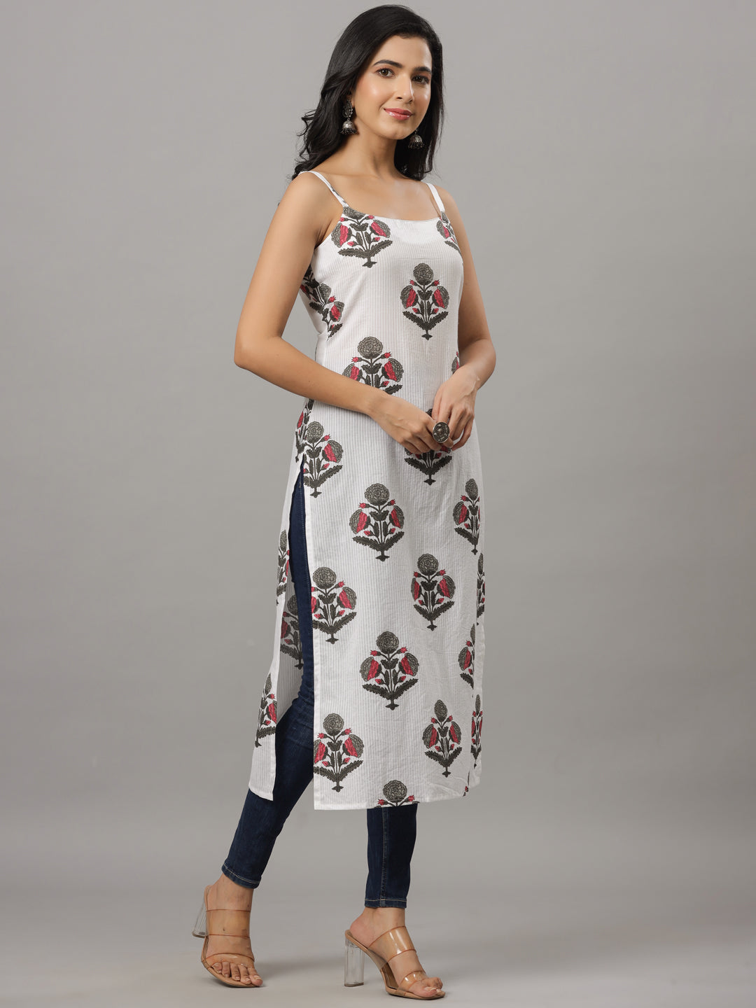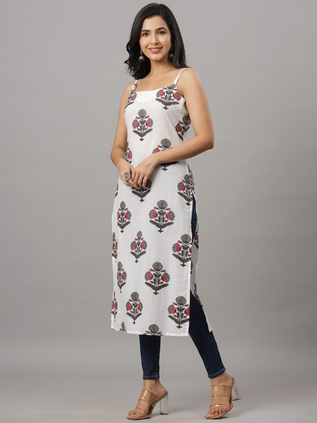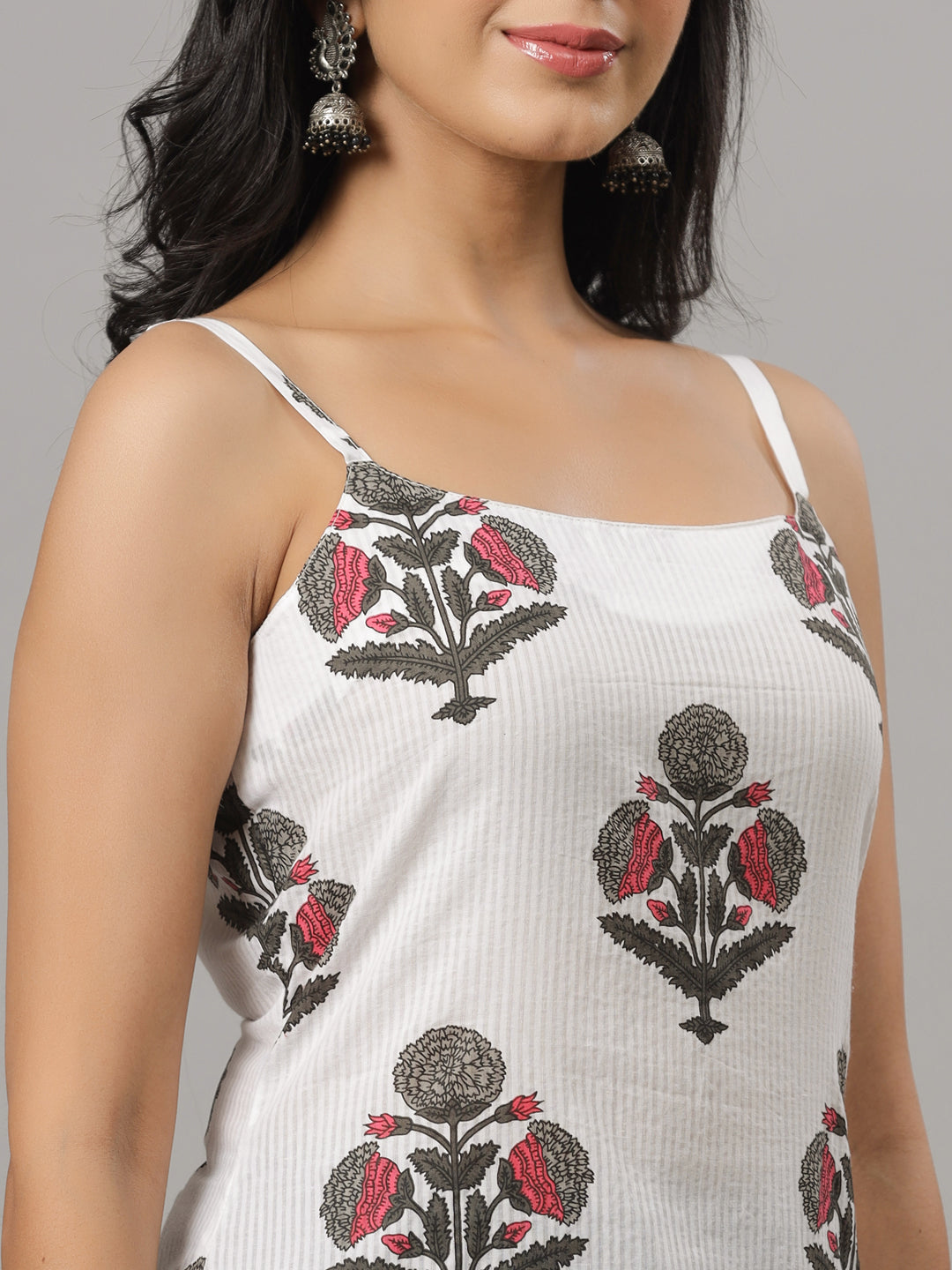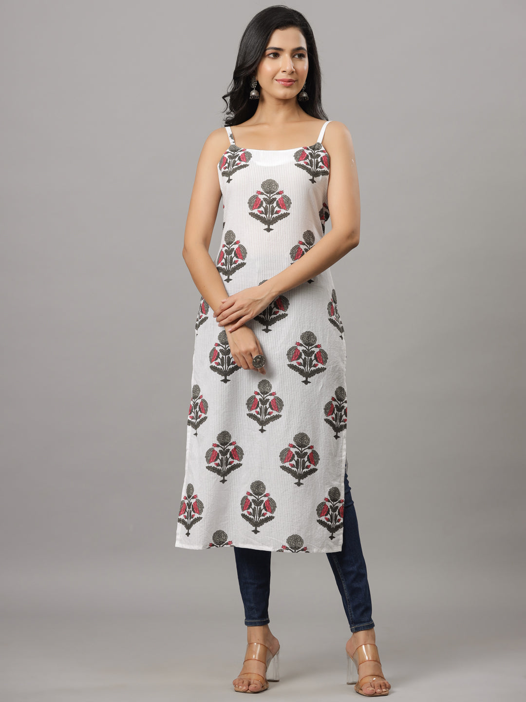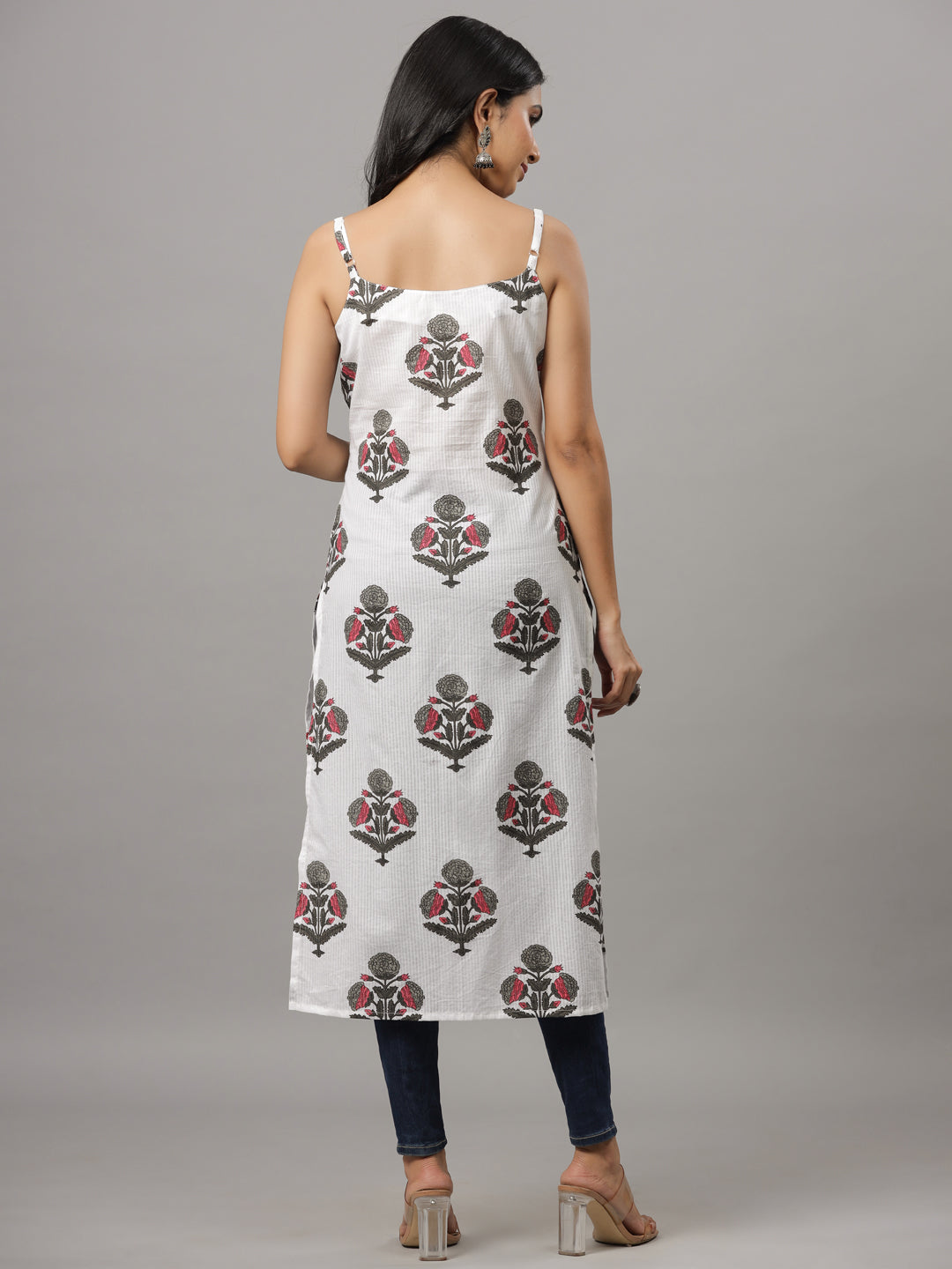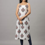 White Dobby & Grey Floral Print Strapped Kurta