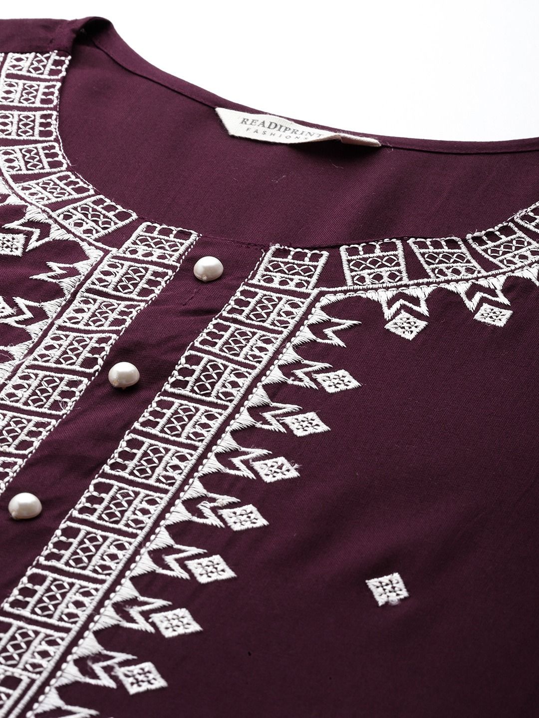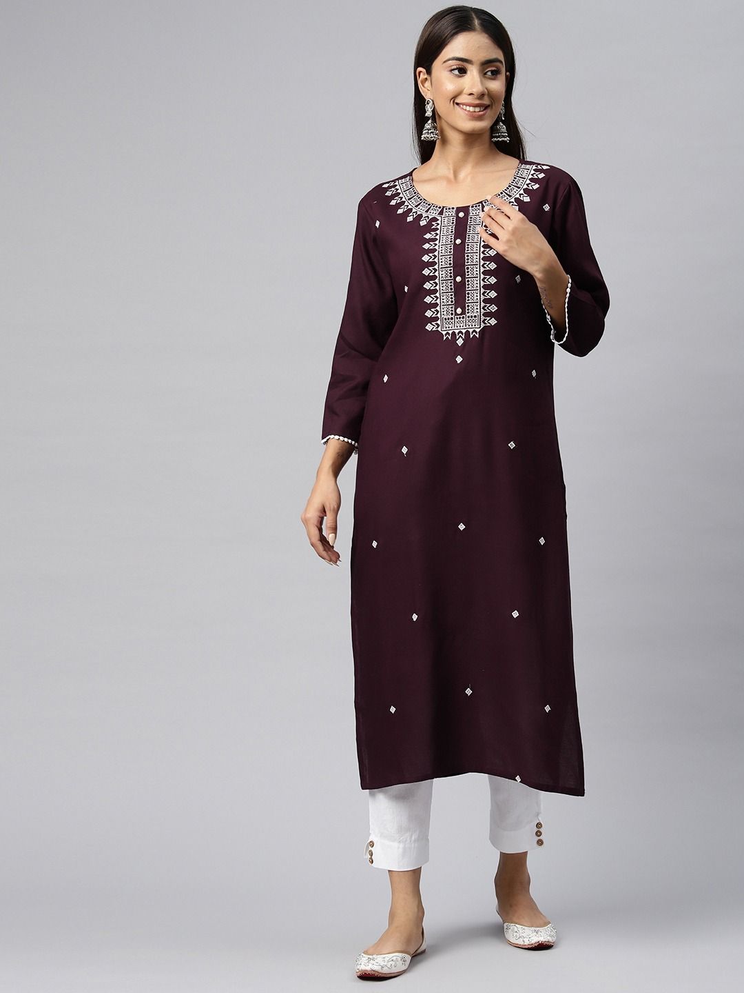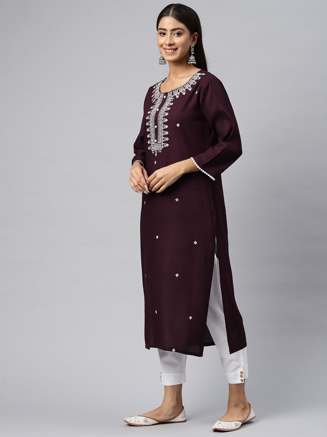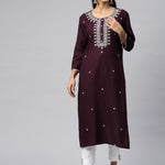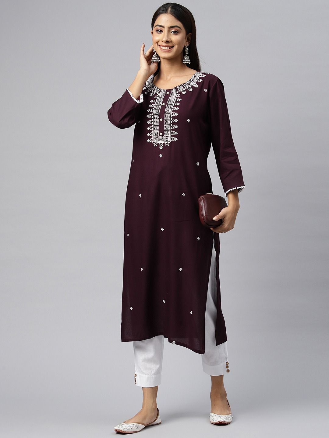 Description - Straight Style Cotton Fabric Violet Color Emboidered Kurti