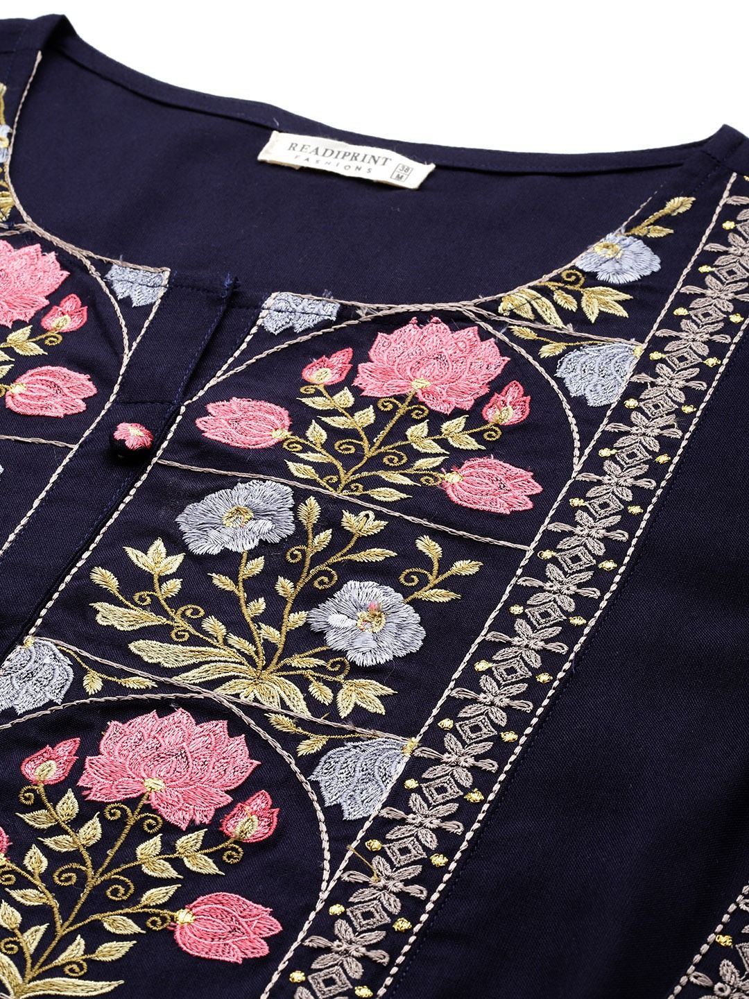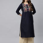 Description - Naira Style Rayon Fabric Navy Blue Color Kurti With Thread & Zari Work