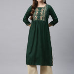 Description - Naira Style Rayon Fabric Green Color Kurti With Thread & Zari Work