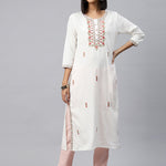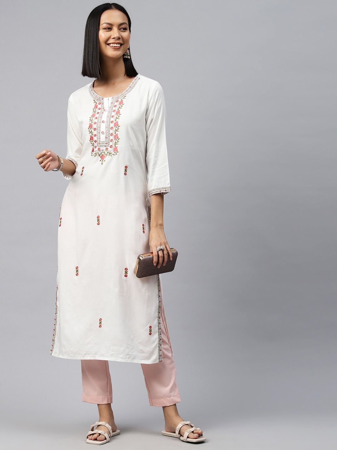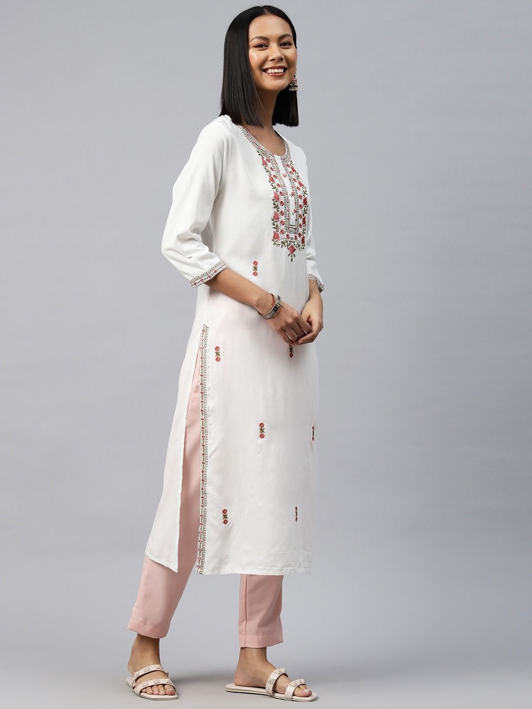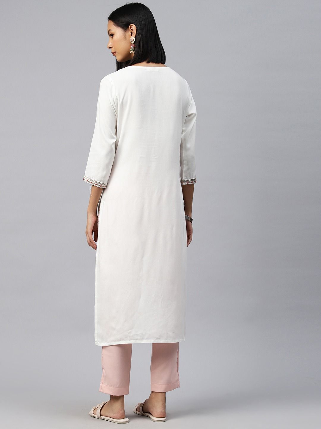 Description - Straight Style Rayon Fabric White Color Kurti With Thread & Zari Work