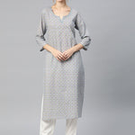 Description - Straight Style Cotton Fabric Grey Color Printed Kurti With Thread And Mirror Work