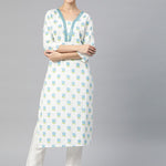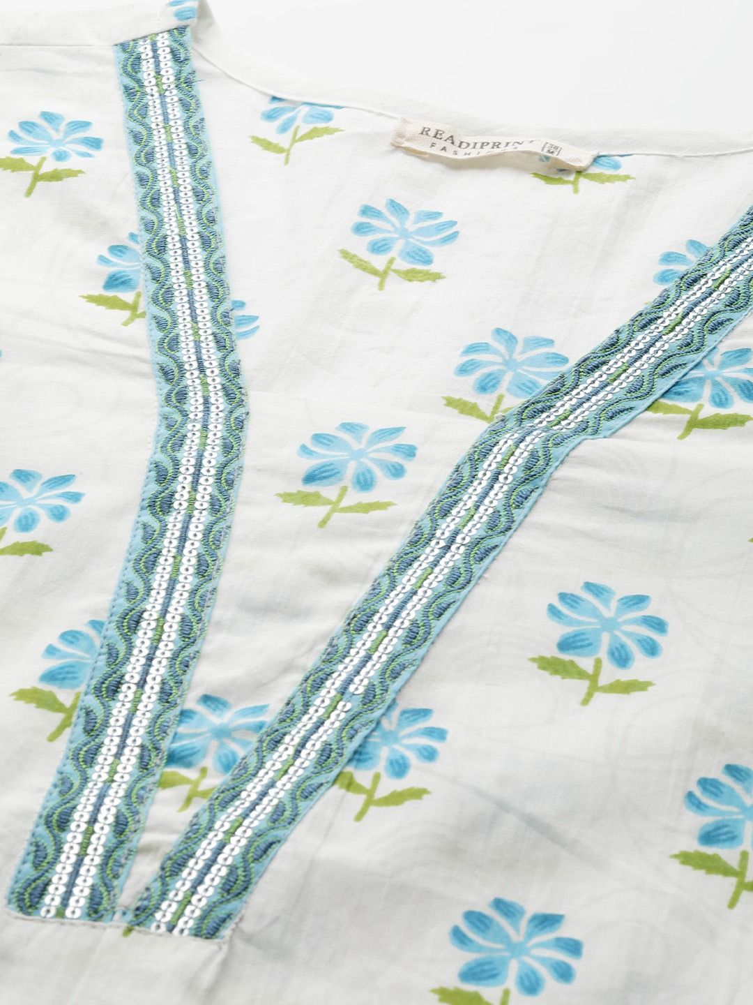 Description - Straight Style Cotton Fabric Blue Color Floral Printed Kurti With Sequin Work