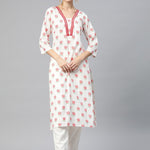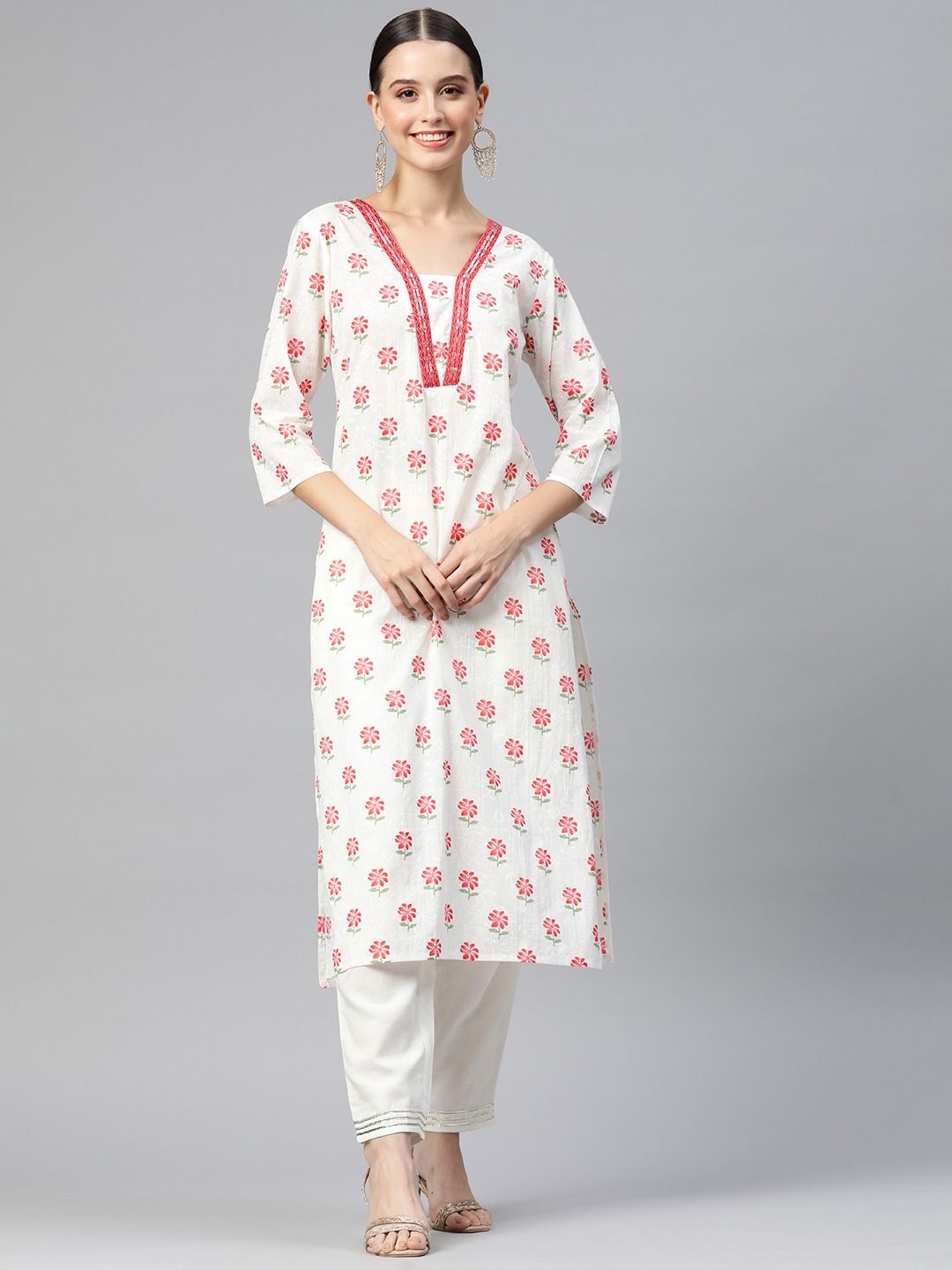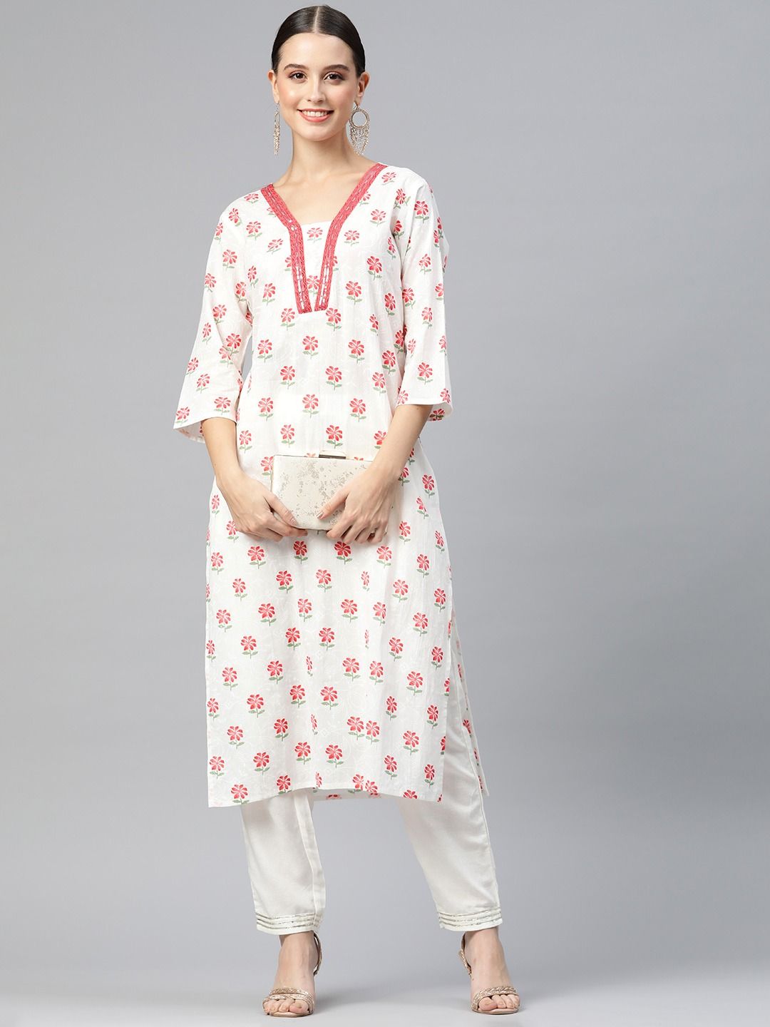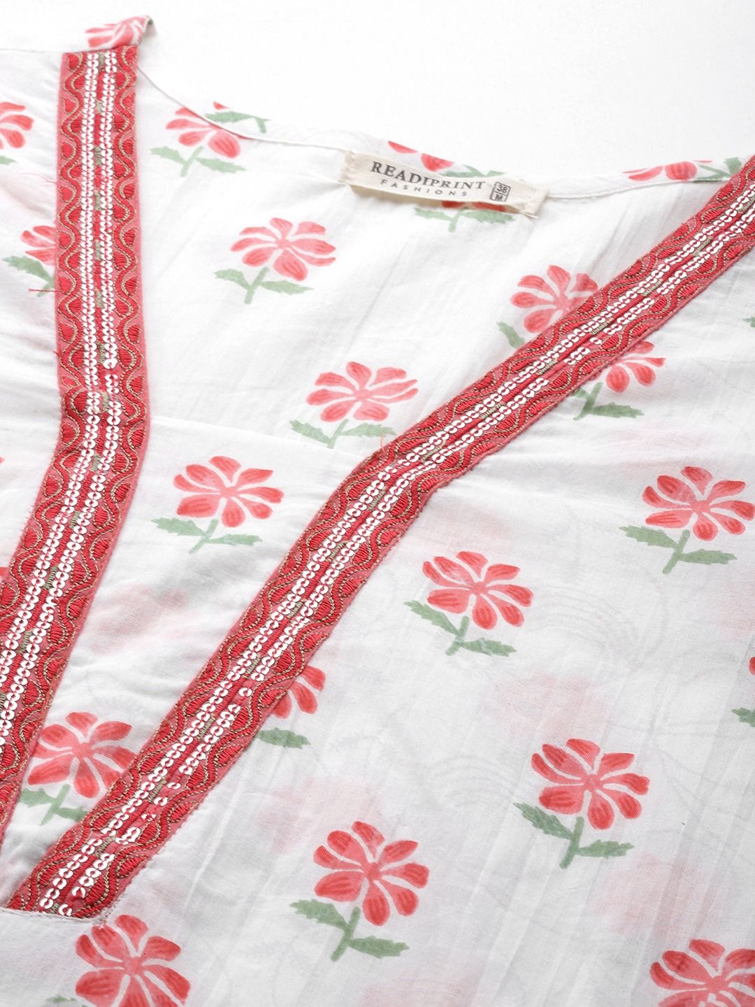 Description - Straight Style Cotton Fabric Red Color Floral Printed Kurti With Sequin Work