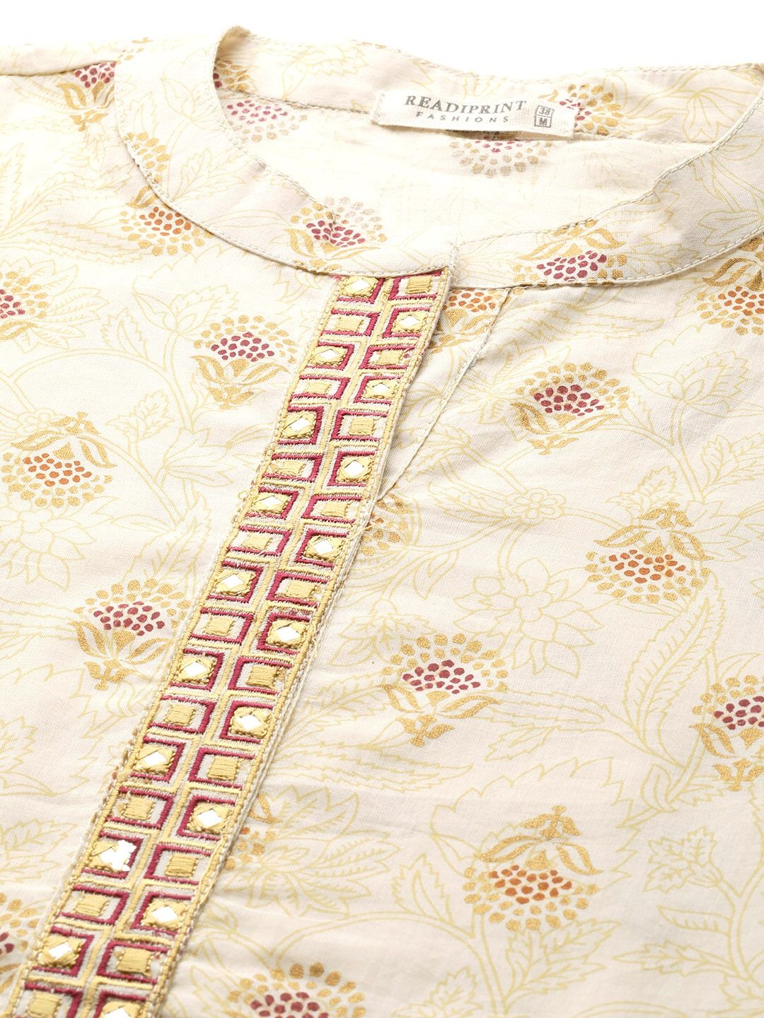Description - Straight Style Cotton Fabric Beige Color Floral Printed Kurti With Thread And Mirror Work