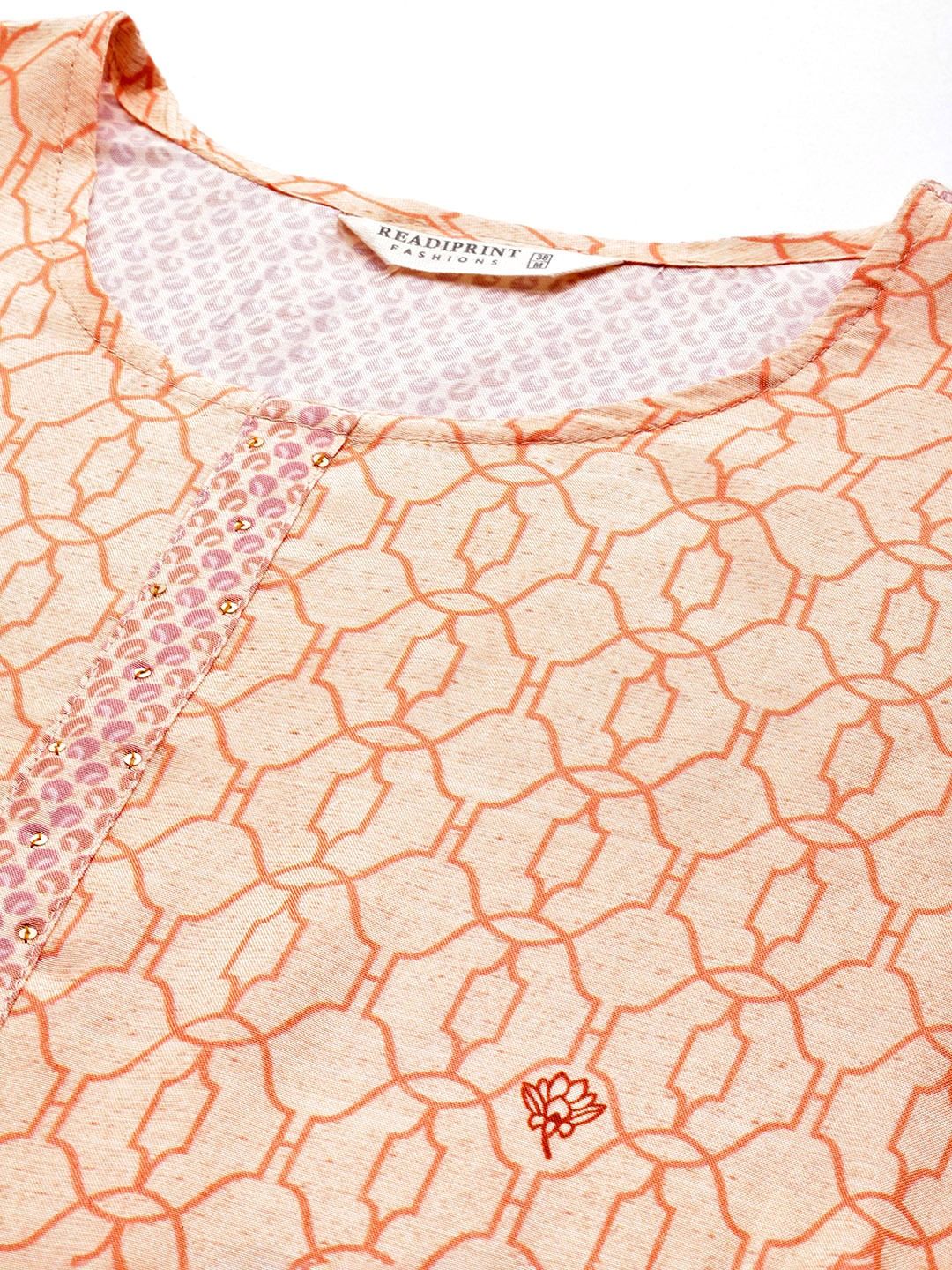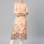 Description - Straight Style Silk Fabric Peach Color Printed Kurti With Sequin Work