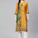 Description - Straight Style Rayon Fabric Mustard Color Printed Kurti With Sequence Work
