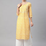 Description - Straight Style Cotton Fabric Yellow Color Kurti With Thread, Mirror & Zari Work