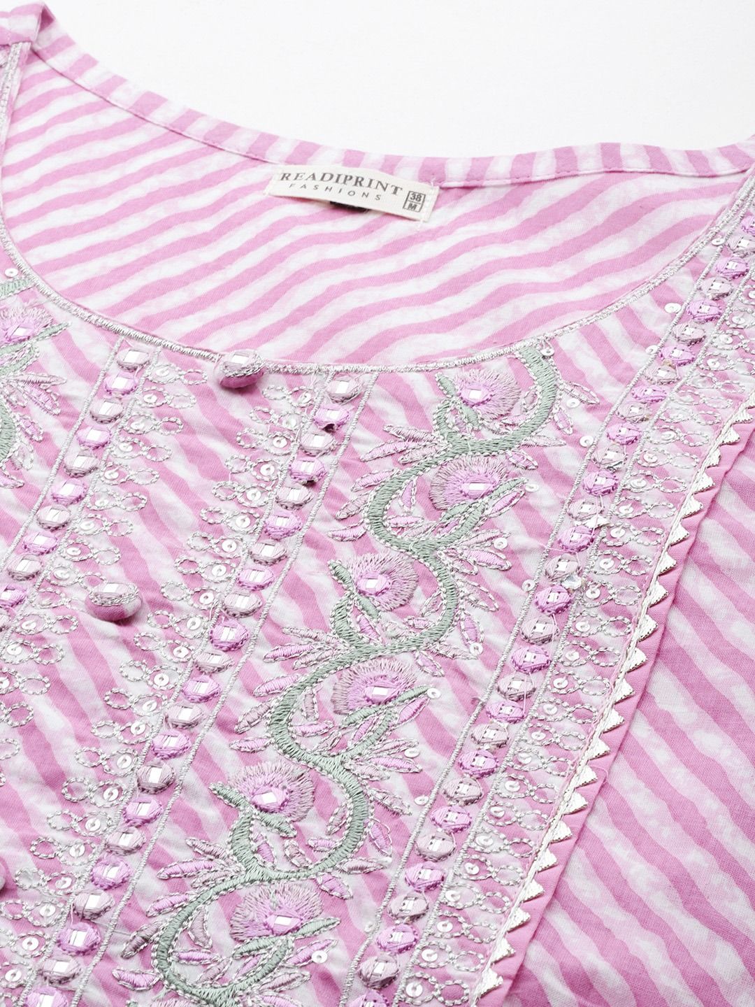 Description - Straight Style Cotton Fabric Lavender Color Kurti With Thread, Mirror & Zari Work