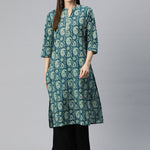 Straight Style Cotton Fabric Teal Color Kurti With Zari & Printed Work