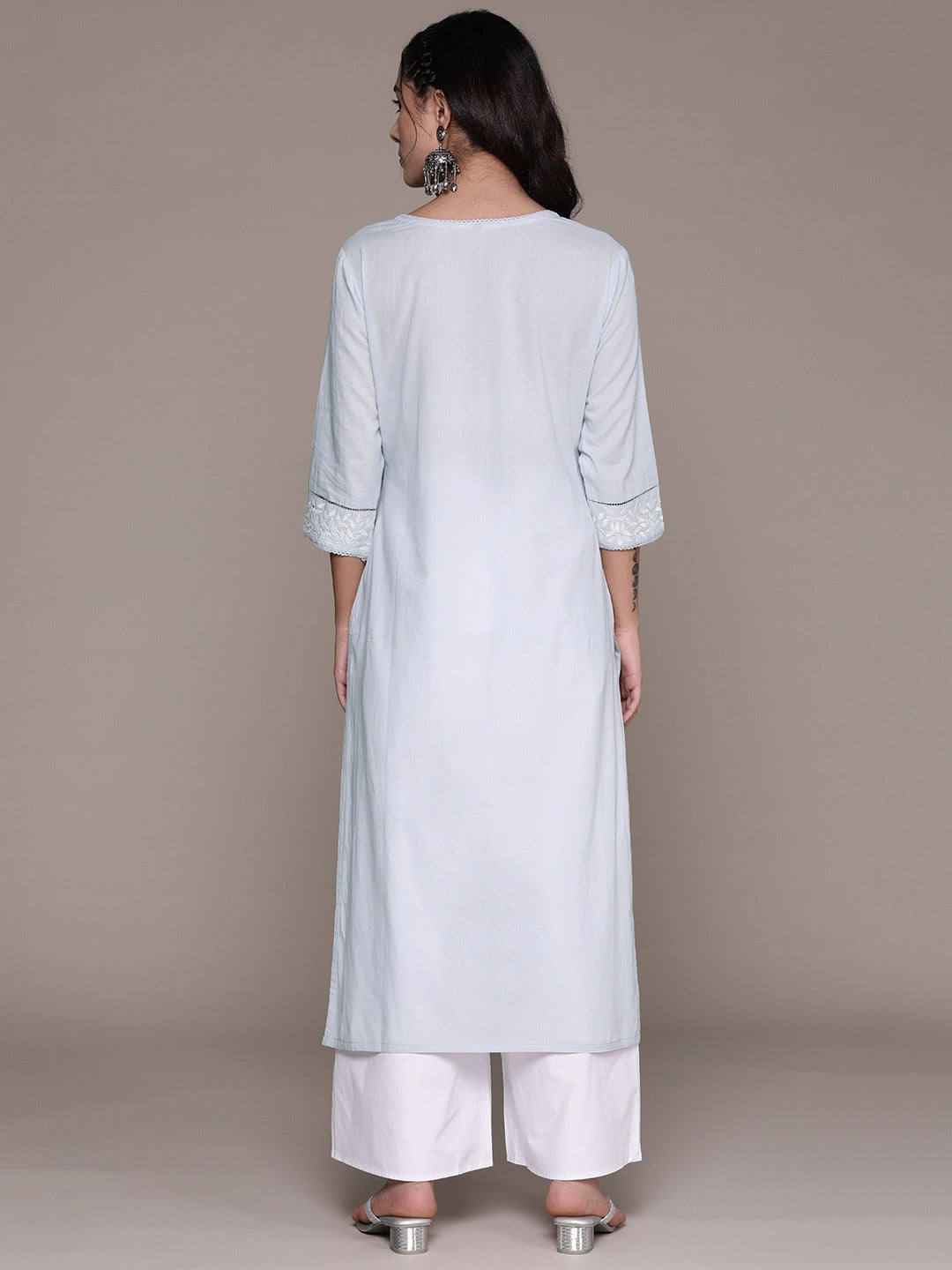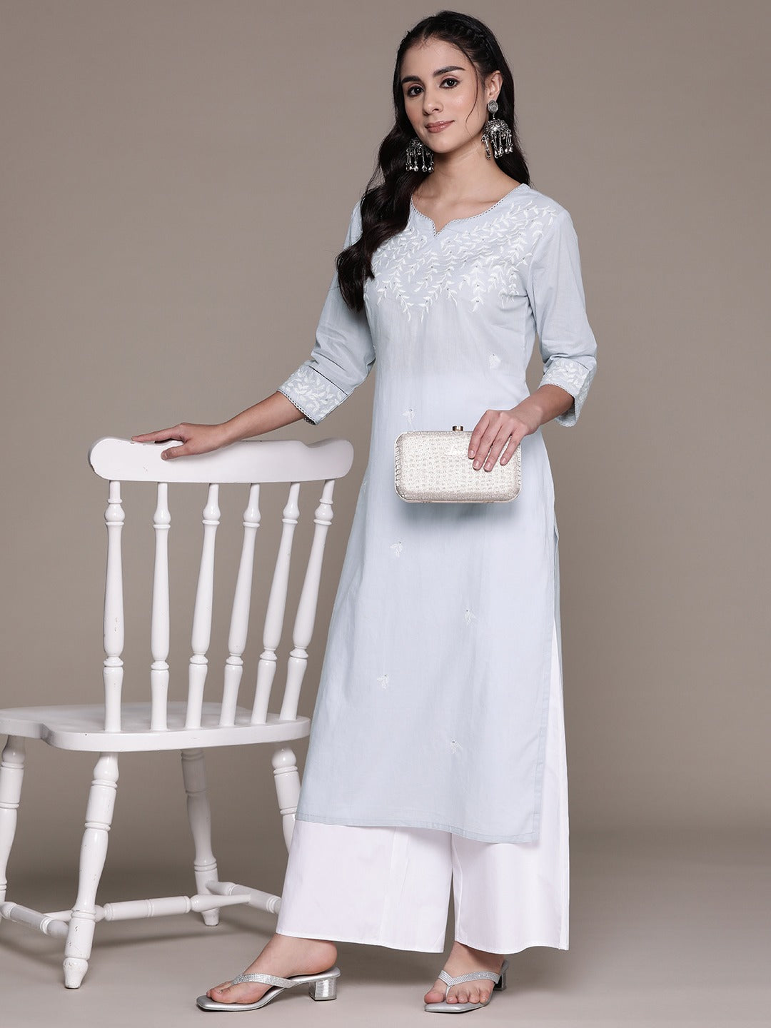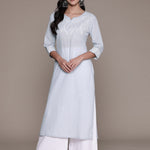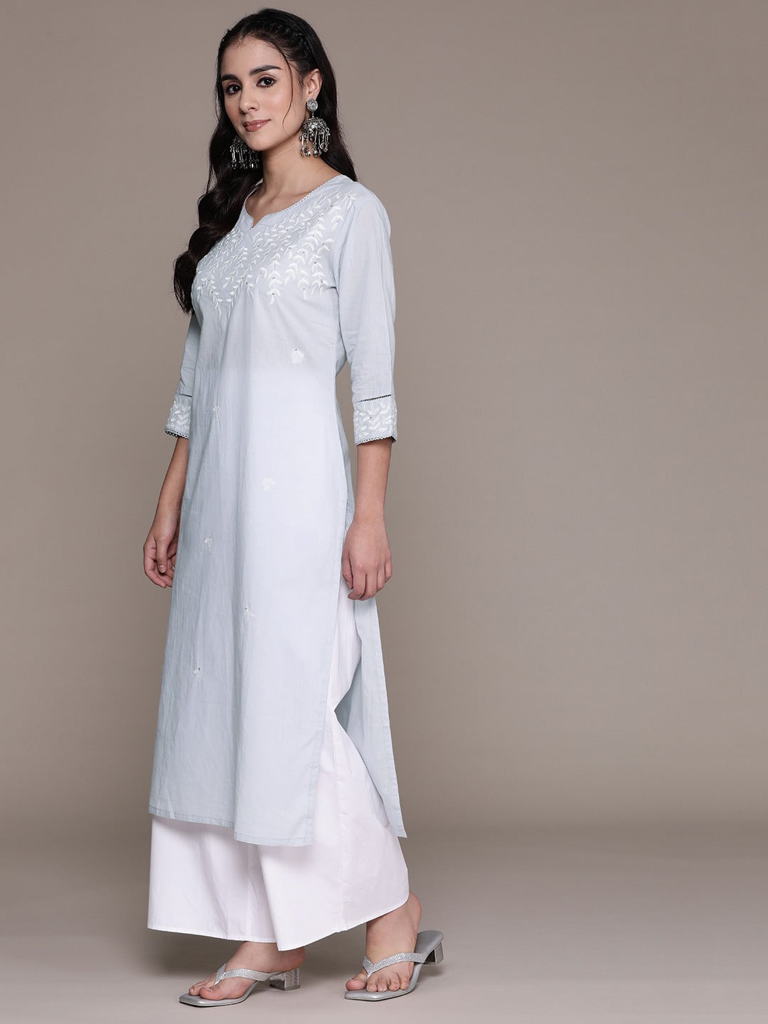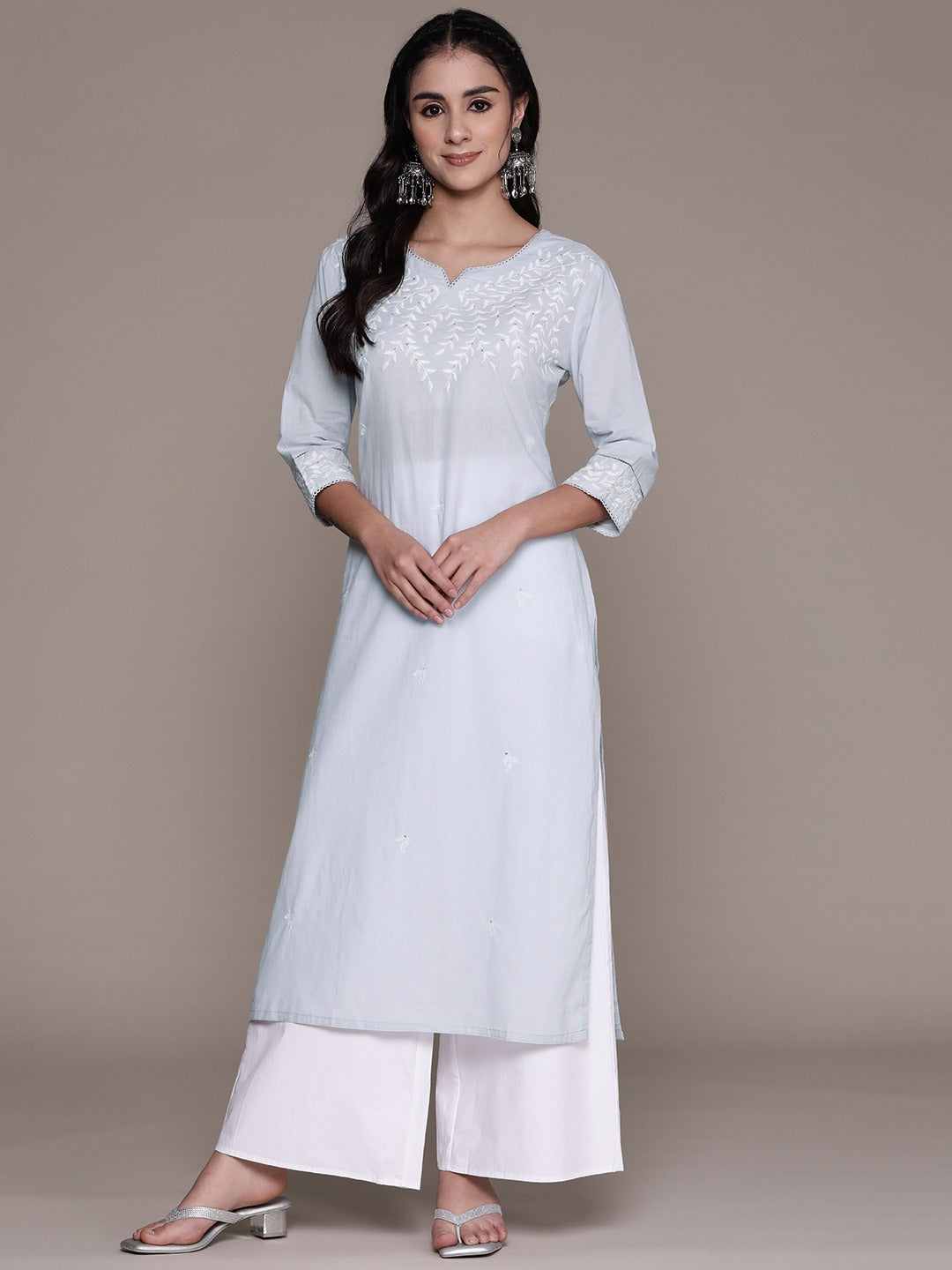 Straight Style Cotton Fabric Grey Color Kurti With Thread & Sequence Work