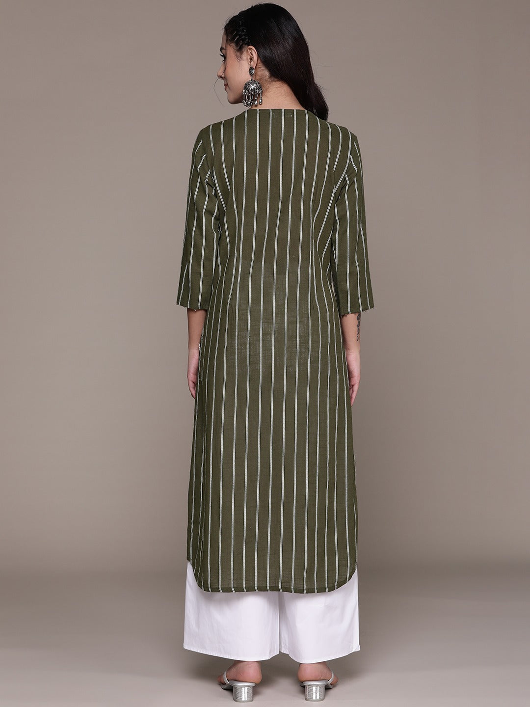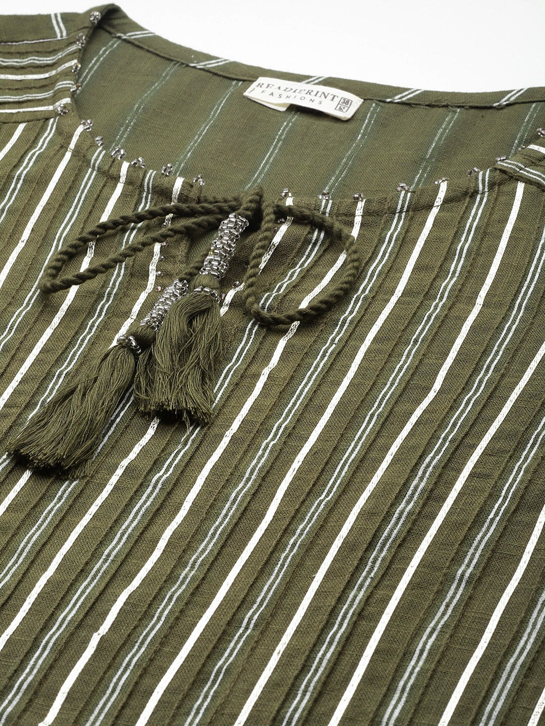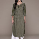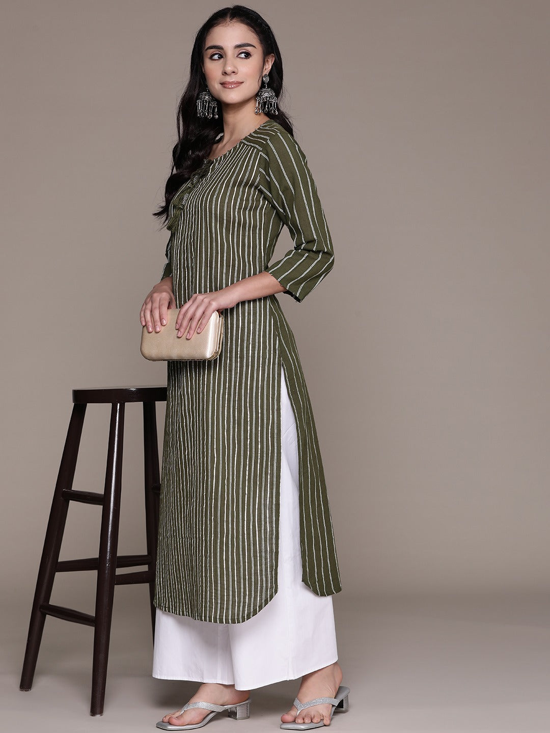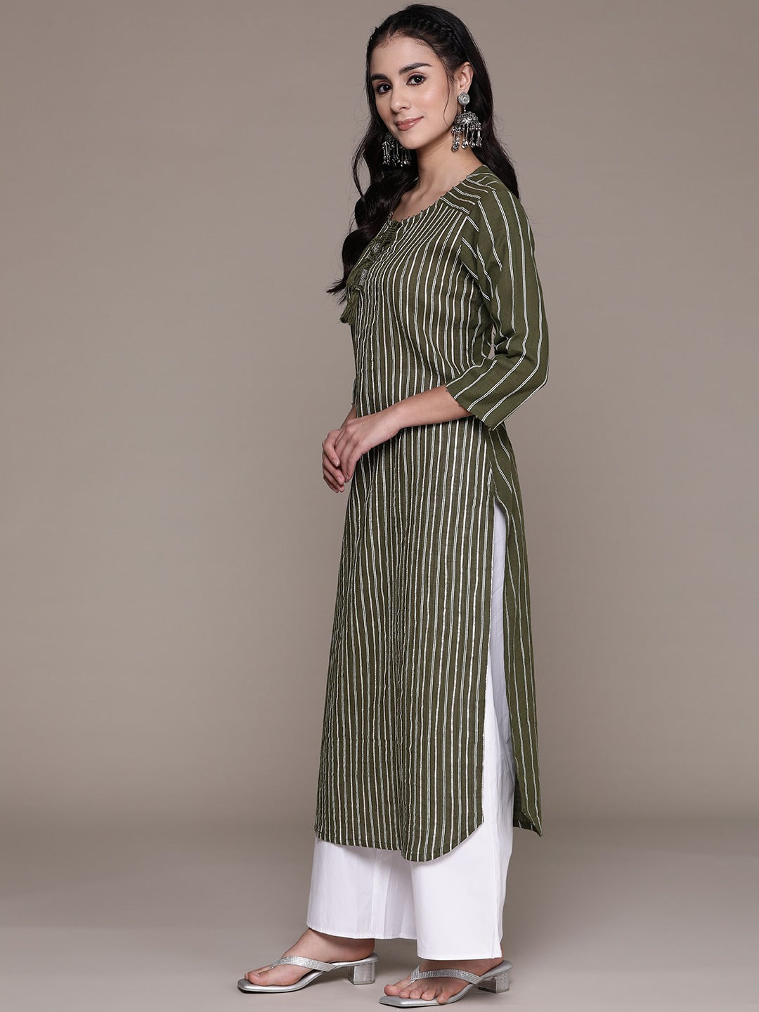 Straight Style Cotton Fabric Olive Green Color Kurti With Gota & Beads Work