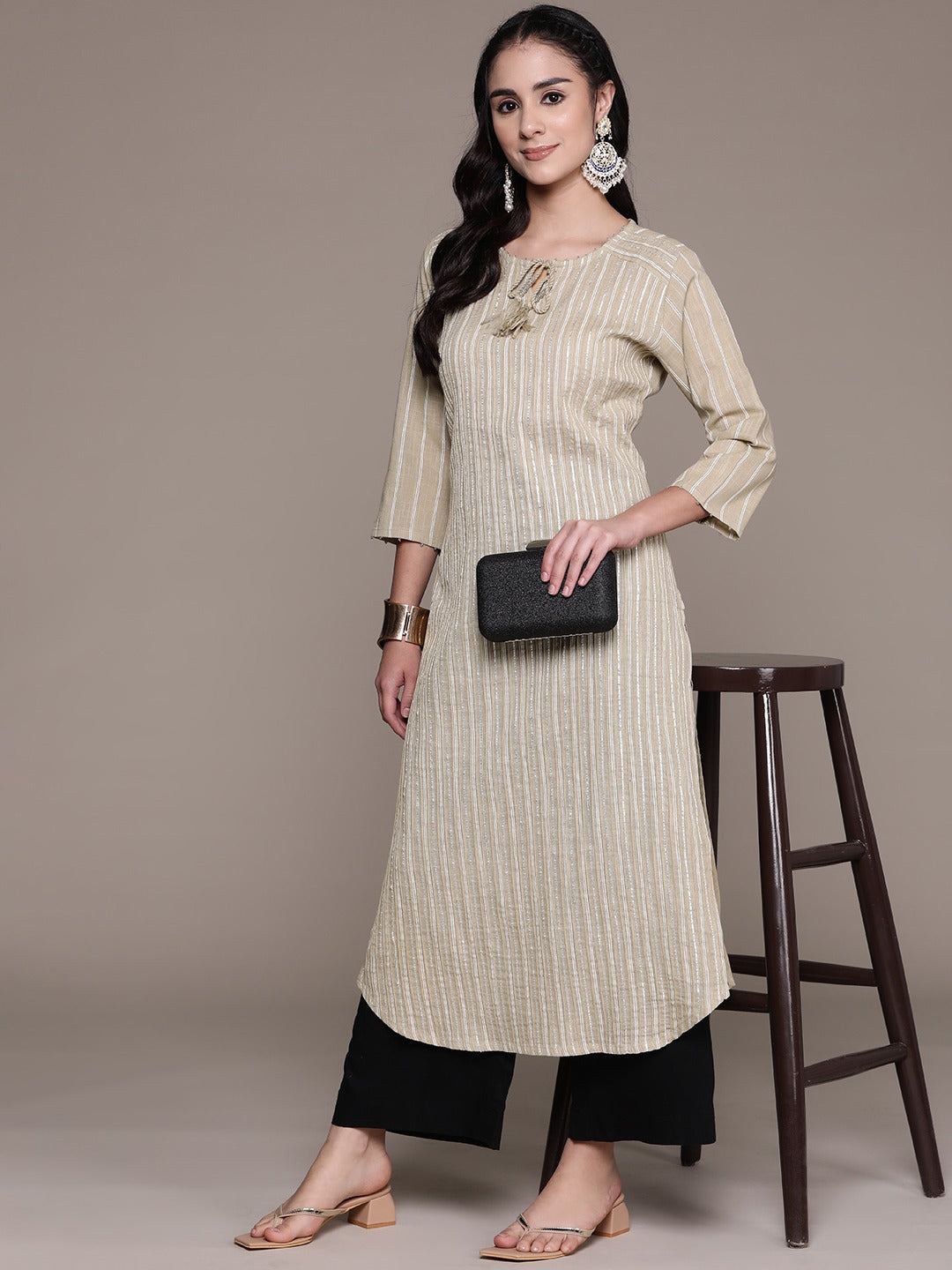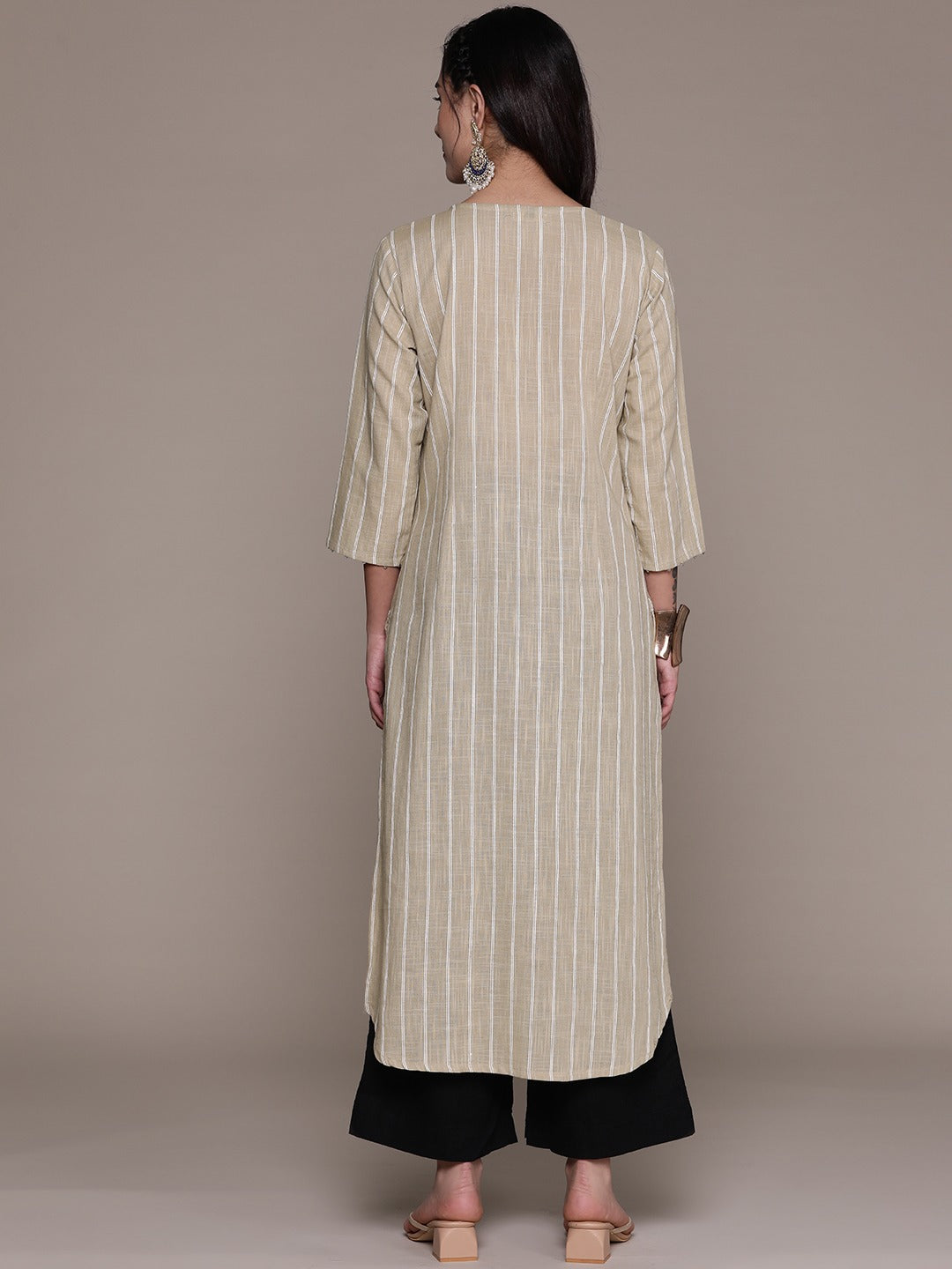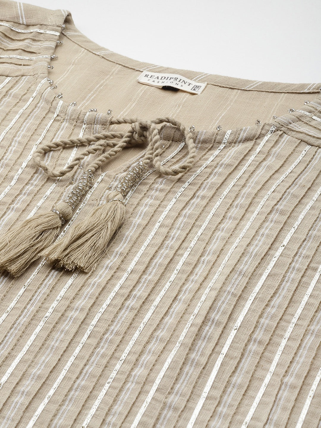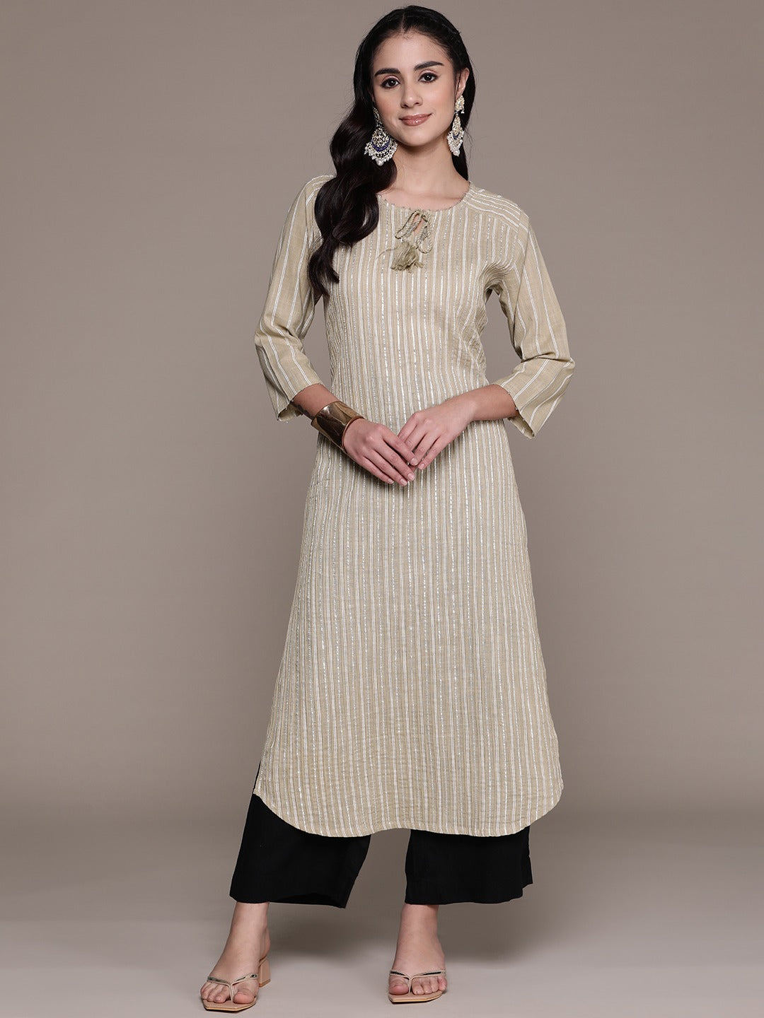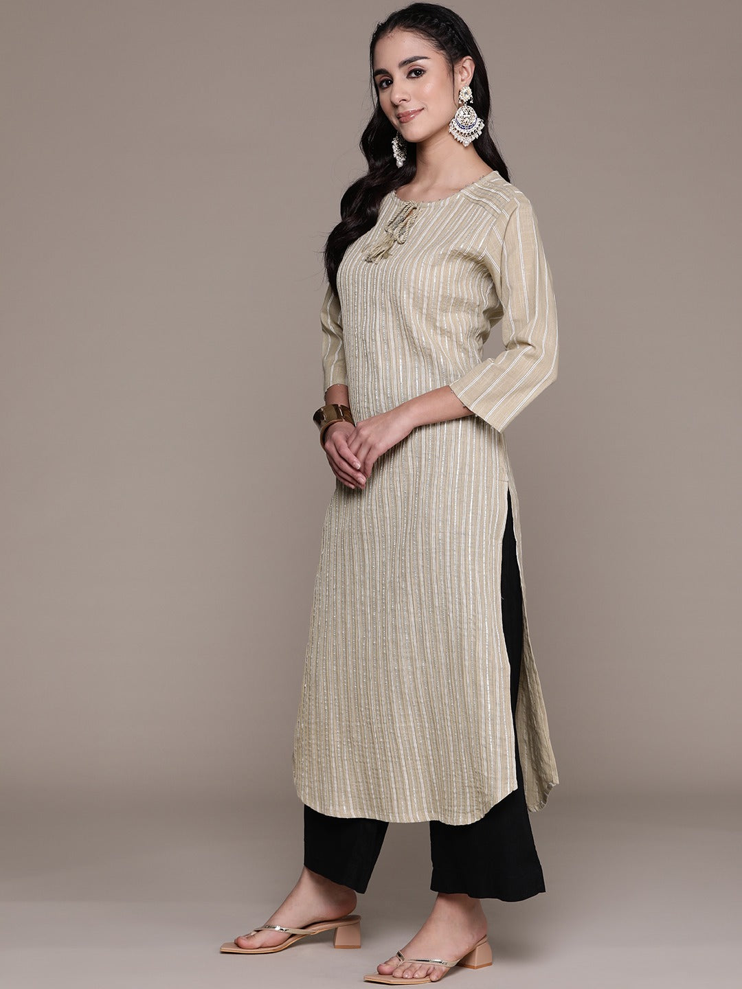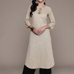 Straight Style Cotton Fabric Beige Color Kurti With Gota & Beads Work