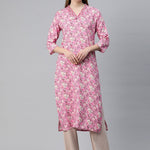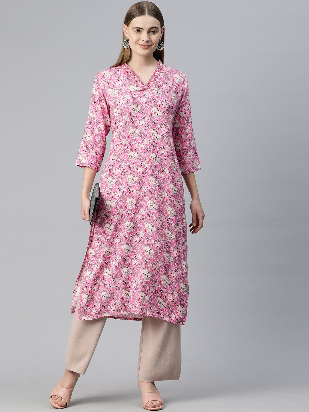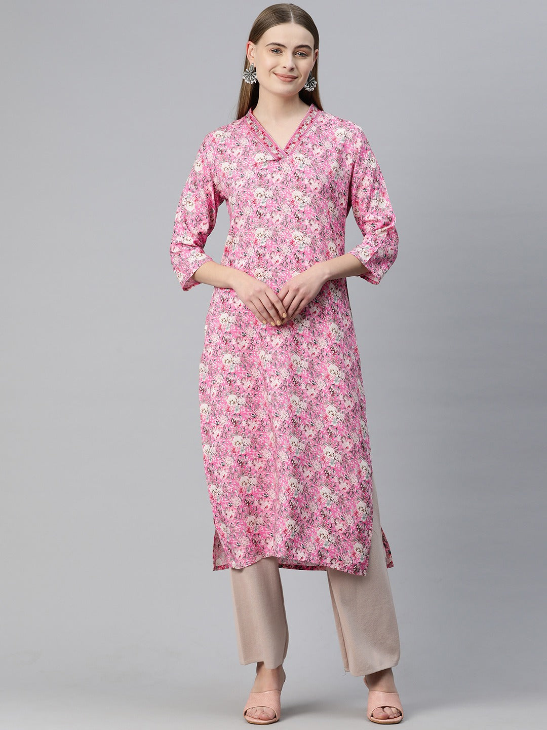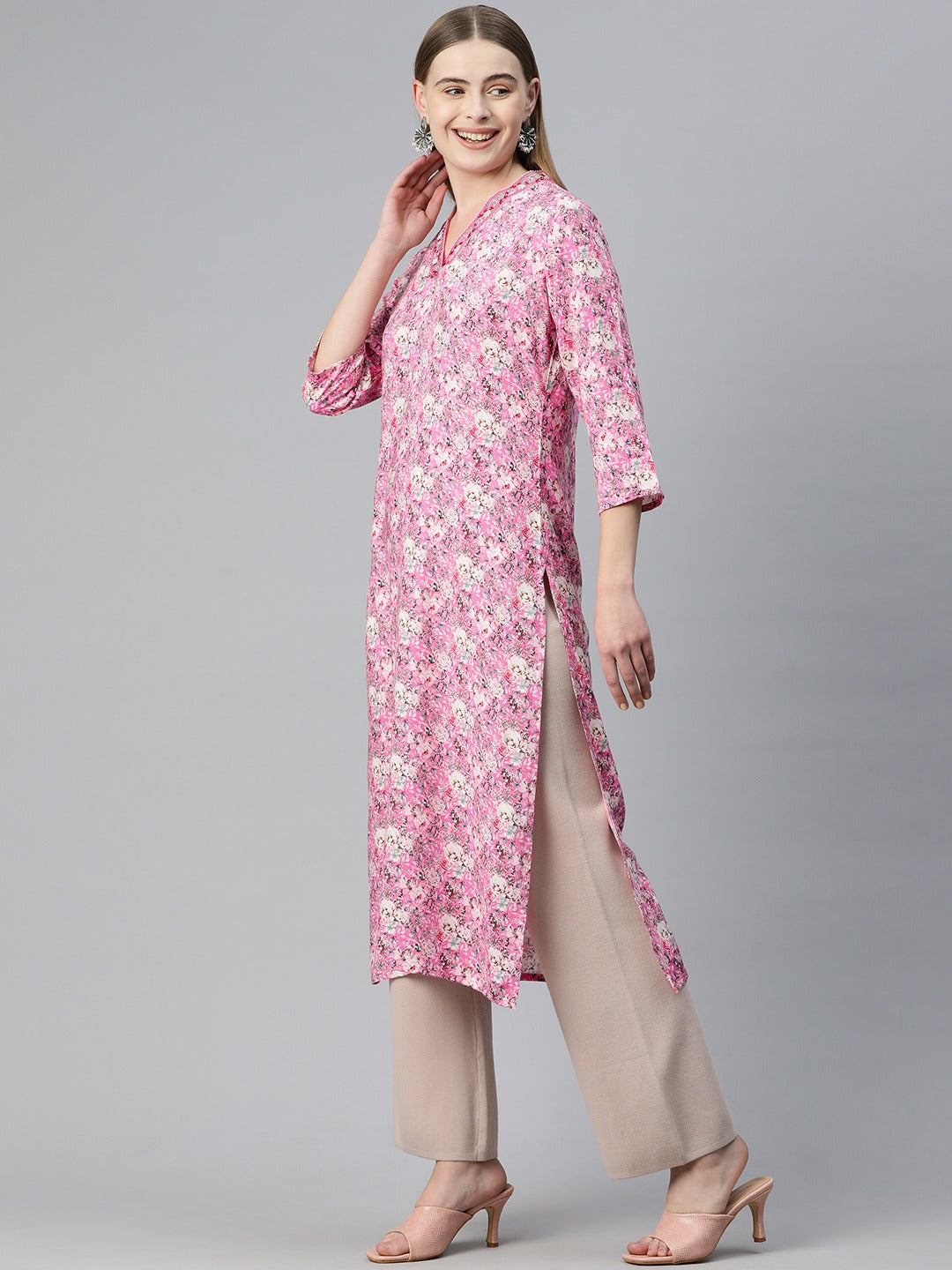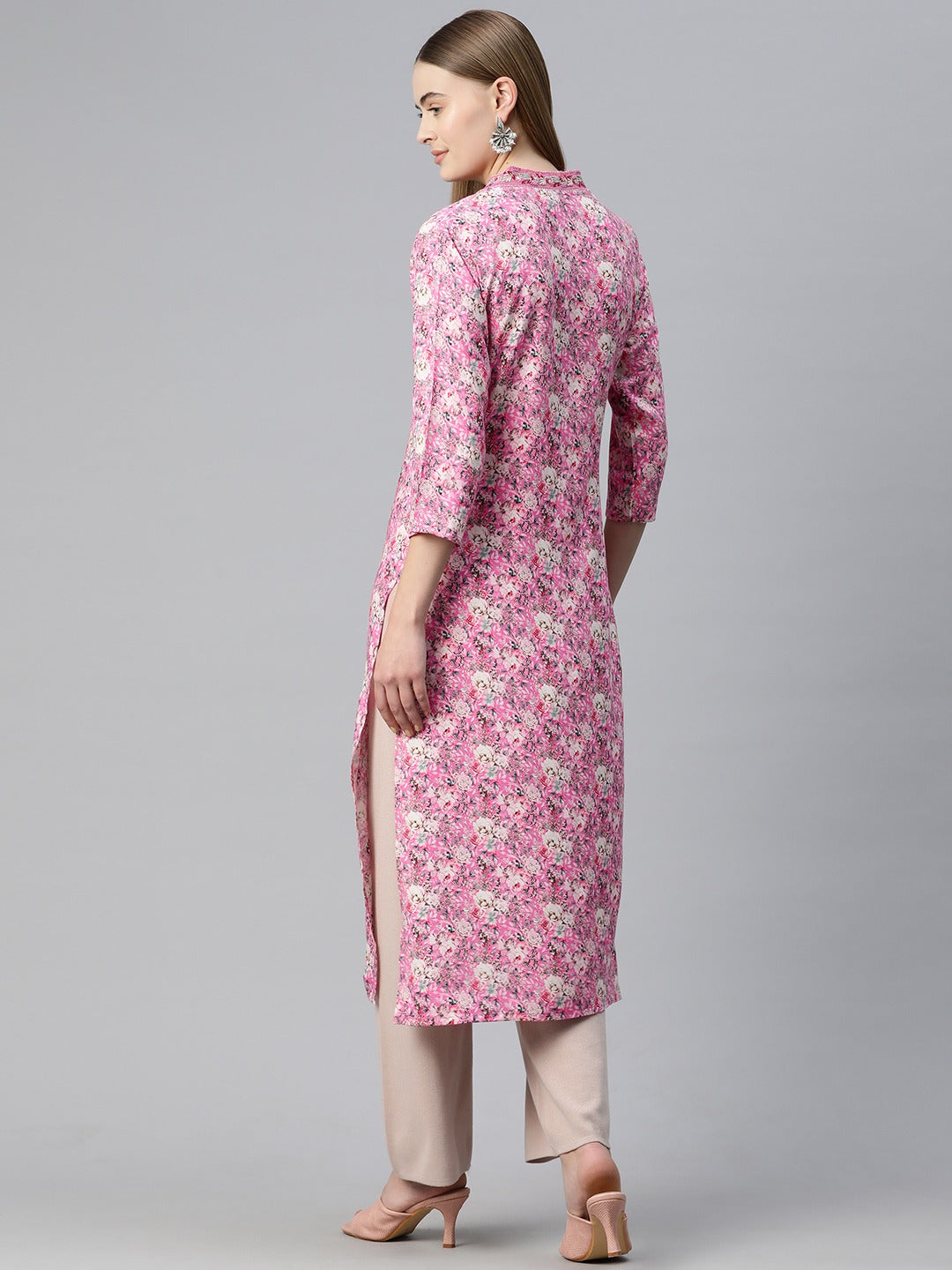 Straight Style Silk Fabric Pink Color Kurti With Thread & Floral Printed Work